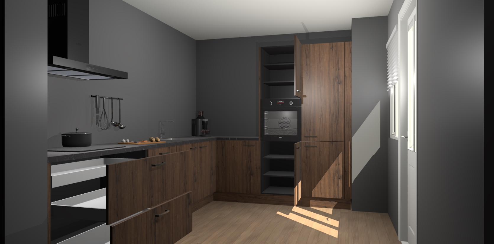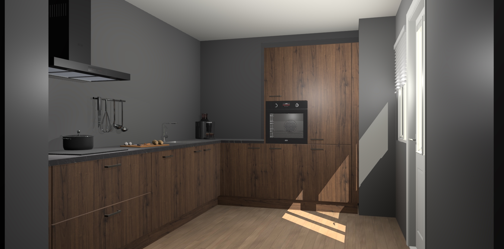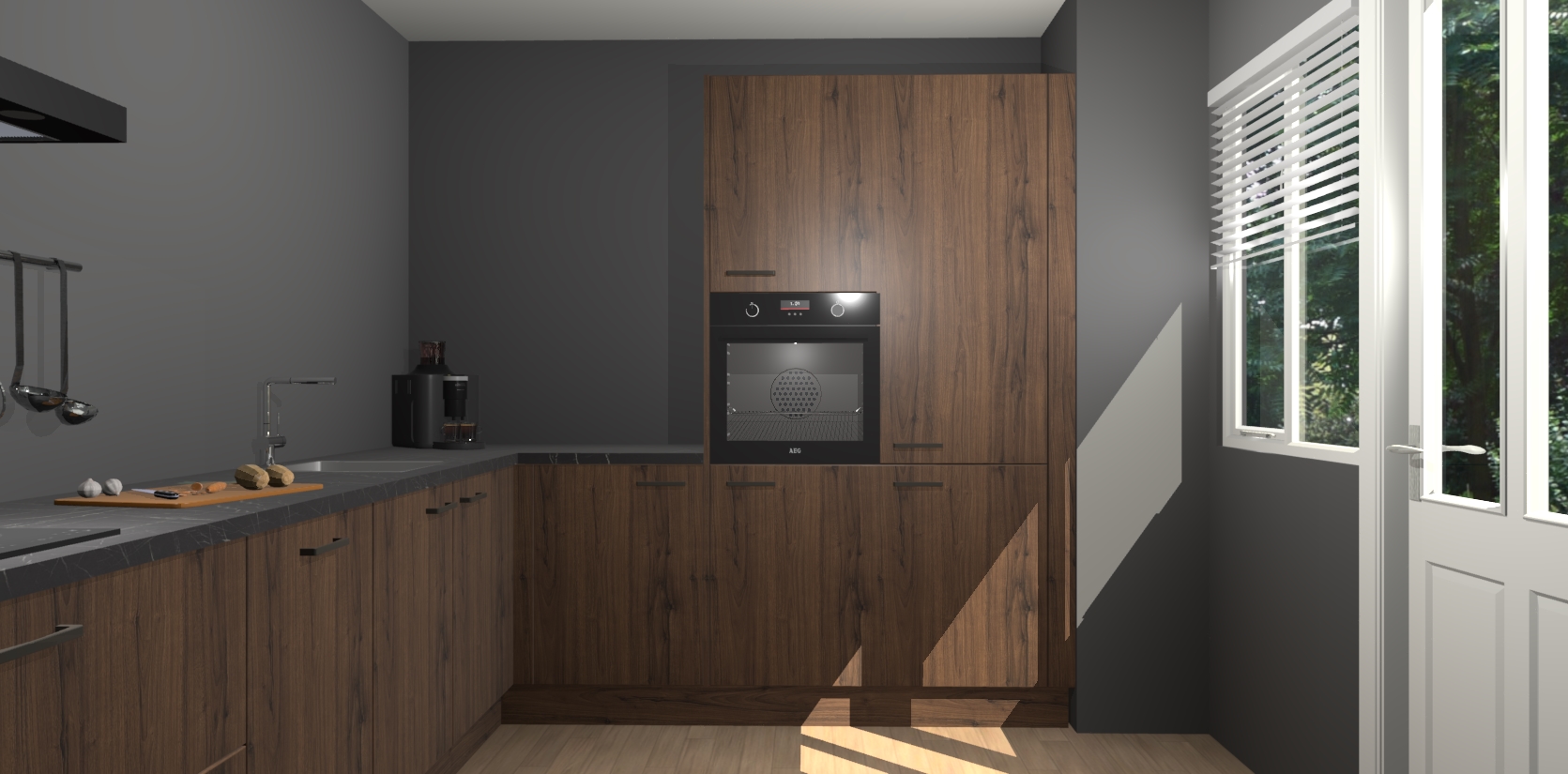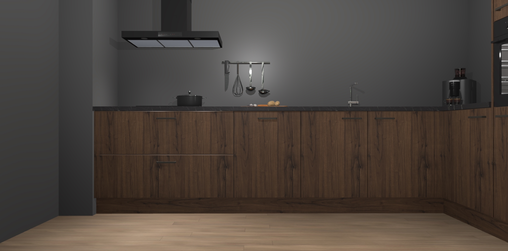 Welkom bij de Noten keuken Portland. Deze prachtige keuken zal de komende jaren het middelpunt van de belangstelling in uw huis zijn. Uitgerust met vijf inbouwapparaten komt u nooit kookgereedschap tekort. Bovendien geeft de warme houtlook elke ruimte een uitnodigende en tijdloze uitstraling.