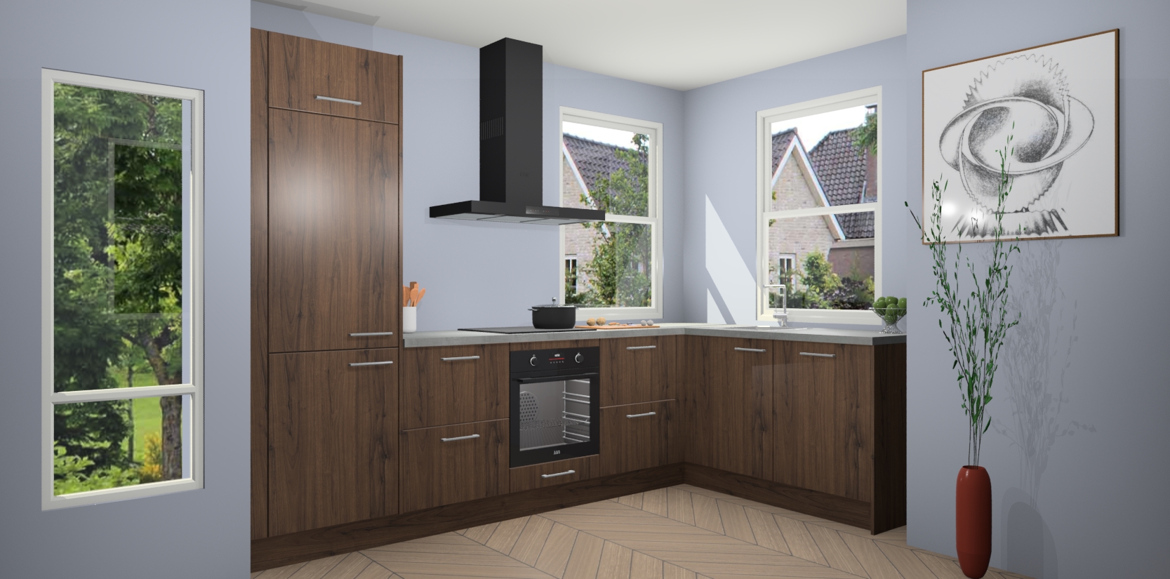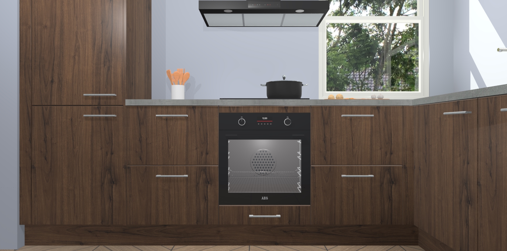 Wat maakt deze keuken zo bijzonder? Ten eerste geeft het houten werkblad uw ruimte een onmiskenbaar klassieke uitstraling. De natuurlijke afwerking roept warmte en elegantie op die nooit uit de mode zullen raken. Bovendien is het gemakkelijk schoon te houden en te onderhouden, zodat je er jarenlang plezier van kunt hebben. Als u op zoek bent naar extra gemak in uw keuken, dan heeft u bij het plaatsen van een bestelling bij ons ook de optie om uw toestellen te upgraden naar AEG-modellen - zo haalt u moderne innovatie van topmerken in apparatentechnologie rechtstreeks in huis.