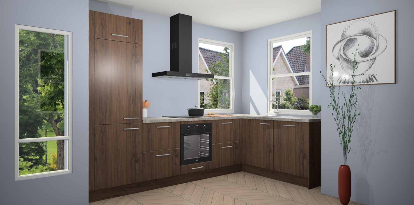 Wat maakt deze keuken zo bijzonder? Ten eerste geeft het houten werkblad uw ruimte een onmiskenbaar klassieke uitstraling. De natuurlijke afwerking roept warmte en elegantie op die nooit uit de mode zullen raken. Bovendien is het gemakkelijk schoon te houden en te onderhouden, zodat je er jarenlang plezier van kunt hebben. Als u op zoek bent naar extra gemak in uw keuken, dan heeft u bij het plaatsen van een bestelling bij ons ook de optie om uw toestellen te upgraden naar AEG-modellen - zo haalt u moderne innovatie van topmerken in apparatentechnologie rechtstreeks in huis.