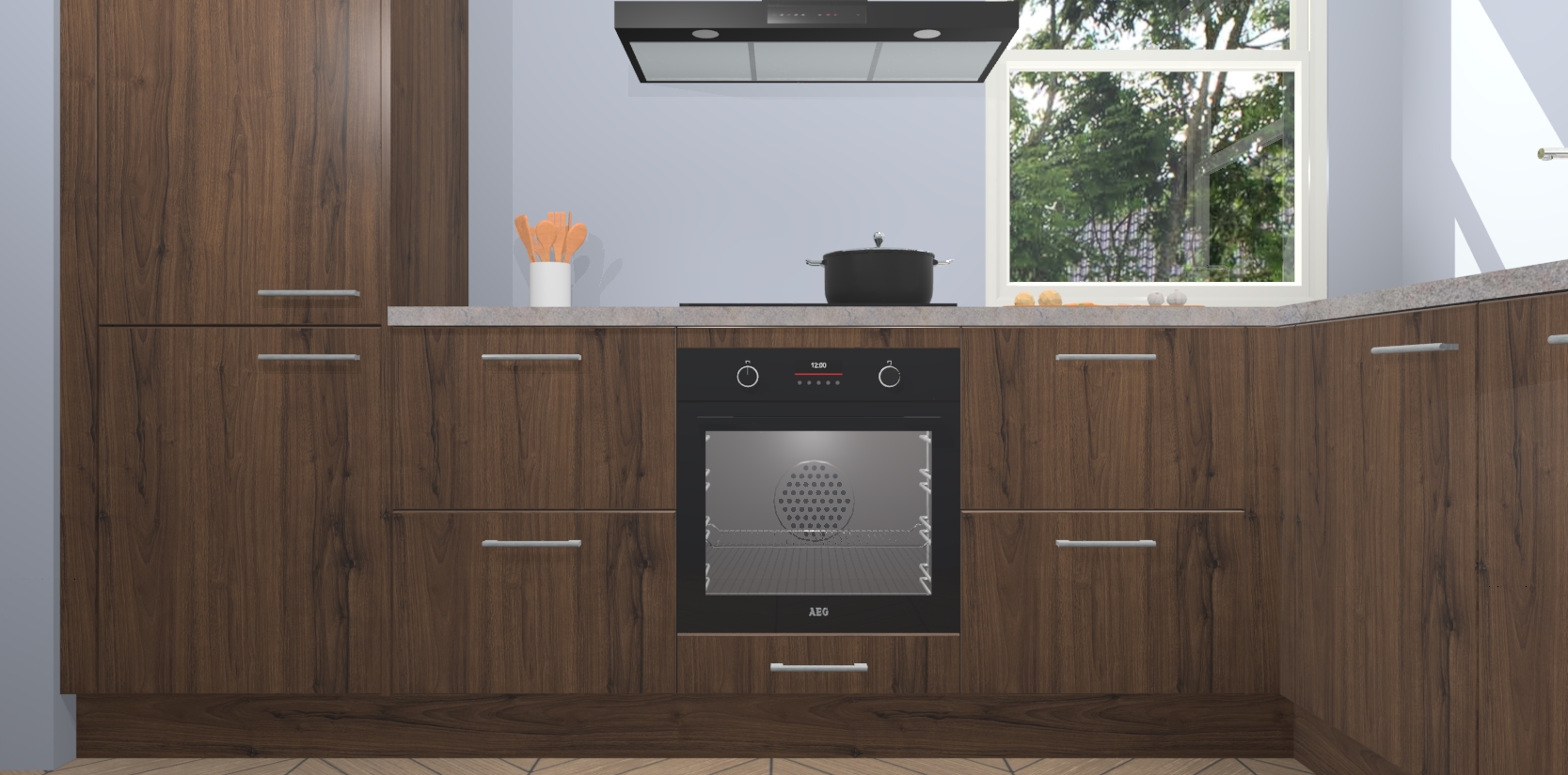 Wat maakt deze keuken zo bijzonder? Ten eerste geeft het houten werkblad uw ruimte een onmiskenbaar klassieke uitstraling. De natuurlijke afwerking roept warmte en elegantie op die nooit uit de mode zullen raken. Bovendien is het gemakkelijk schoon te houden en te onderhouden, zodat je er jarenlang plezier van kunt hebben. Als u op zoek bent naar extra gemak in uw keuken, dan heeft u bij het plaatsen van een bestelling bij ons ook de optie om uw toestellen te upgraden naar AEG-modellen - zo haalt u moderne innovatie van topmerken in apparatentechnologie rechtstreeks in huis.