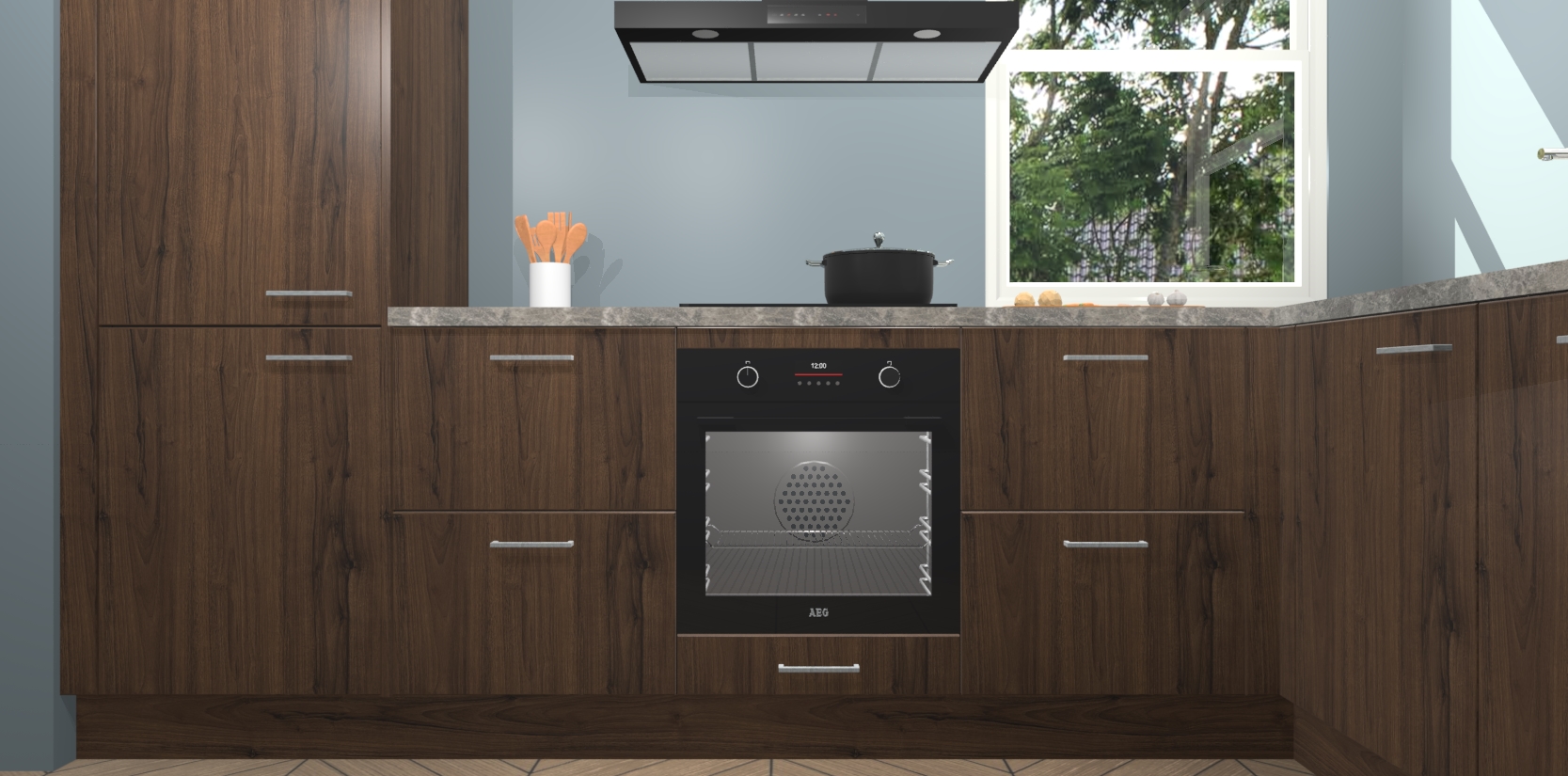 Wat maakt deze keuken zo bijzonder? Ten eerste geeft het houten werkblad uw ruimte een onmiskenbaar klassieke uitstraling. De natuurlijke afwerking roept warmte en elegantie op die nooit uit de mode zullen raken. Bovendien is het gemakkelijk schoon te houden en te onderhouden, zodat je er jarenlang plezier van kunt hebben. Als u op zoek bent naar extra gemak in uw keuken, dan heeft u bij het plaatsen van een bestelling bij ons ook de optie om uw toestellen te upgraden naar AEG-modellen - zo haalt u moderne innovatie van topmerken in apparatentechnologie rechtstreeks in huis.