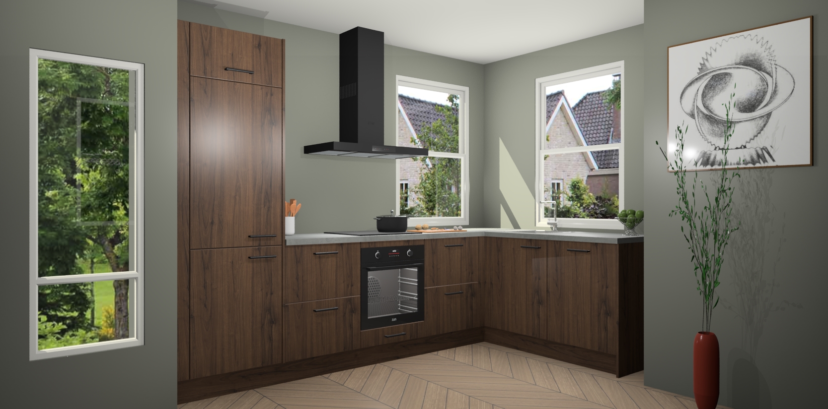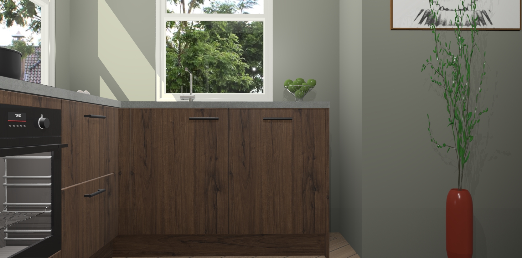 Wat maakt deze keuken zo bijzonder? Ten eerste geeft het houten werkblad uw ruimte een onmiskenbaar klassieke uitstraling. De natuurlijke afwerking roept warmte en elegantie op die nooit uit de mode zullen raken. Bovendien is het gemakkelijk schoon te houden en te onderhouden, zodat je er jarenlang plezier van kunt hebben. Als u op zoek bent naar extra gemak in uw keuken, dan heeft u bij het plaatsen van een bestelling bij ons ook de optie om uw toestellen te upgraden naar AEG-modellen - zo haalt u moderne innovatie van topmerken in apparatentechnologie rechtstreeks in huis.