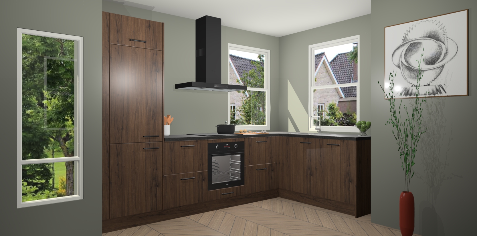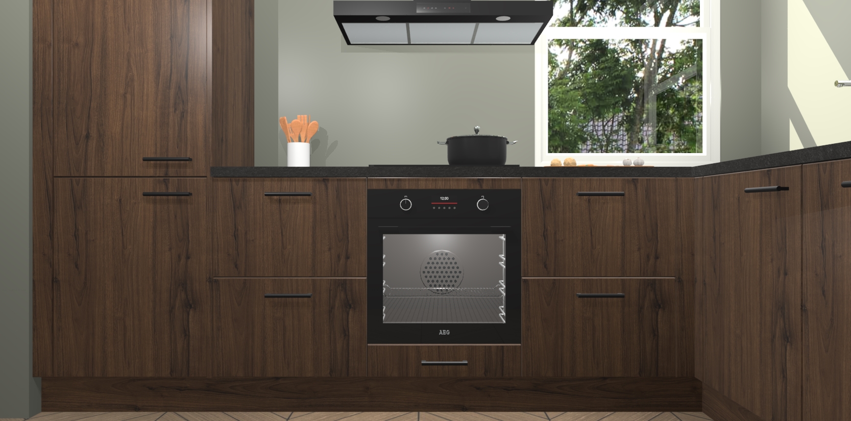 Wat maakt deze keuken zo bijzonder? Ten eerste geeft het houten werkblad uw ruimte een onmiskenbaar klassieke uitstraling. De natuurlijke afwerking roept warmte en elegantie op die nooit uit de mode zullen raken. Bovendien is het gemakkelijk schoon te houden en te onderhouden, zodat je er jarenlang plezier van kunt hebben. Als u op zoek bent naar extra gemak in uw keuken, dan heeft u bij het plaatsen van een bestelling bij ons ook de optie om uw toestellen te upgraden naar AEG-modellen - zo haalt u moderne innovatie van topmerken in apparatentechnologie rechtstreeks in huis.