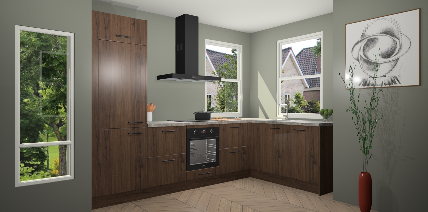 Wat maakt deze keuken zo bijzonder? Ten eerste geeft het houten werkblad uw ruimte een onmiskenbaar klassieke uitstraling. De natuurlijke afwerking roept warmte en elegantie op die nooit uit de mode zullen raken. Bovendien is het gemakkelijk schoon te houden en te onderhouden, zodat je er jarenlang plezier van kunt hebben. Als u op zoek bent naar extra gemak in uw keuken, dan heeft u bij het plaatsen van een bestelling bij ons ook de optie om uw toestellen te upgraden naar AEG-modellen - zo haalt u moderne innovatie van topmerken in apparatentechnologie rechtstreeks in huis.