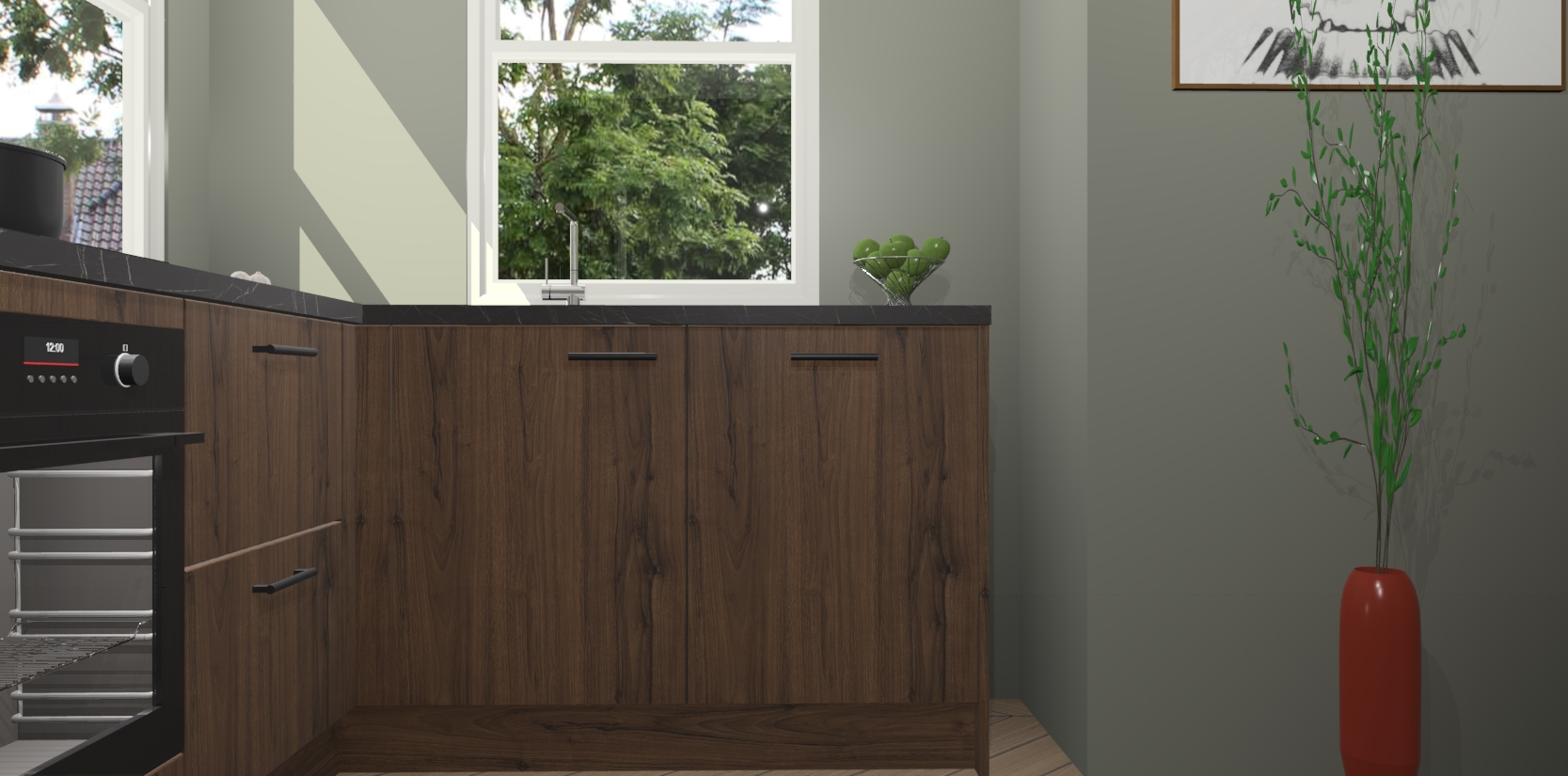 Wat maakt deze keuken zo bijzonder? Ten eerste geeft het houten werkblad uw ruimte een onmiskenbaar klassieke uitstraling. De natuurlijke afwerking roept warmte en elegantie op die nooit uit de mode zullen raken. Bovendien is het gemakkelijk schoon te houden en te onderhouden, zodat je er jarenlang plezier van kunt hebben. Als u op zoek bent naar extra gemak in uw keuken, dan heeft u bij het plaatsen van een bestelling bij ons ook de optie om uw toestellen te upgraden naar AEG-modellen - zo haalt u moderne innovatie van topmerken in apparatentechnologie rechtstreeks in huis.