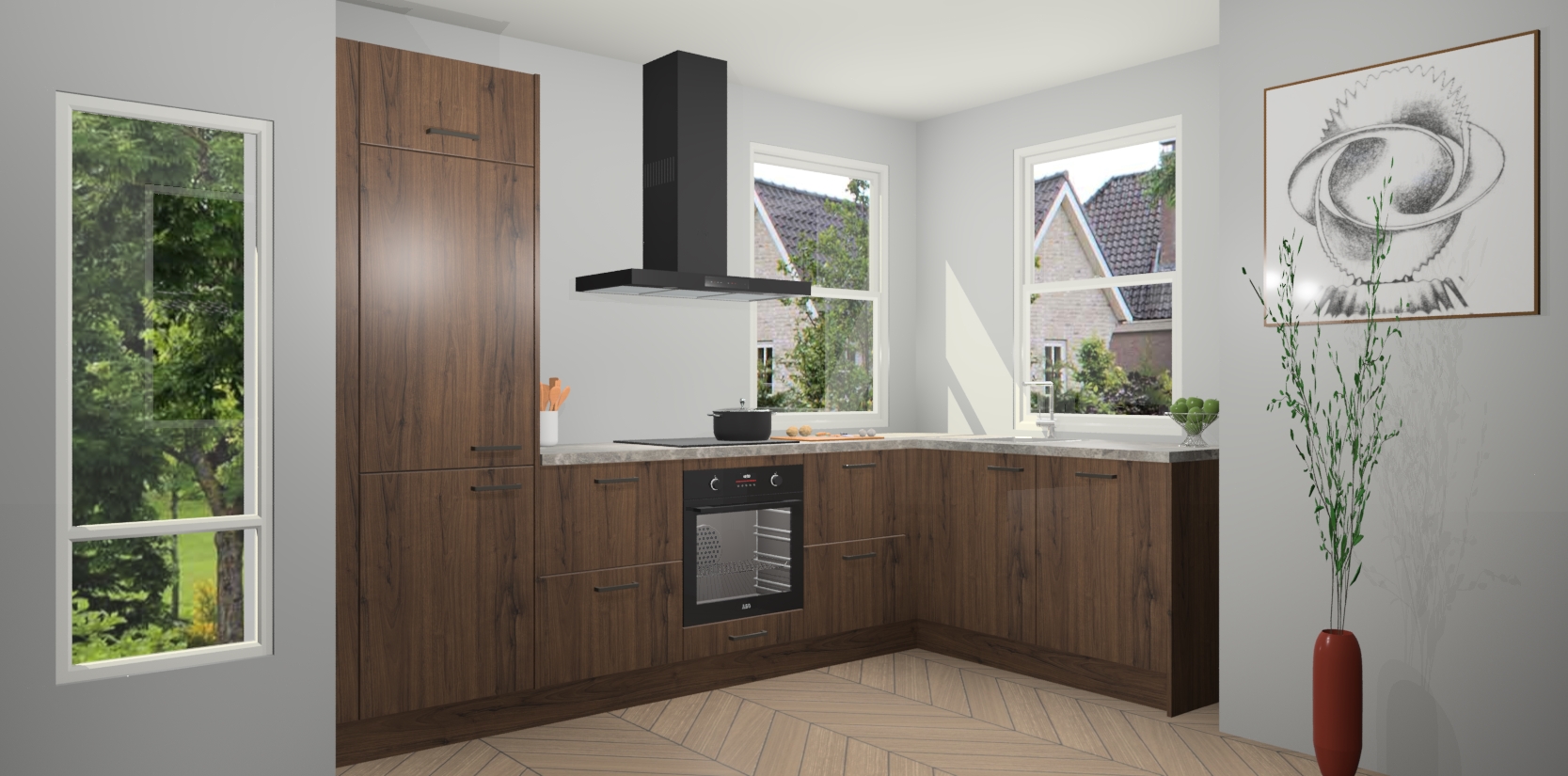 Wat maakt deze keuken zo bijzonder? Ten eerste geeft het houten werkblad uw ruimte een onmiskenbaar klassieke uitstraling. De natuurlijke afwerking roept warmte en elegantie op die nooit uit de mode zullen raken. Bovendien is het gemakkelijk schoon te houden en te onderhouden, zodat je er jarenlang plezier van kunt hebben. Als u op zoek bent naar extra gemak in uw keuken, dan heeft u bij het plaatsen van een bestelling bij ons ook de optie om uw toestellen te upgraden naar AEG-modellen - zo haalt u moderne innovatie van topmerken in apparatentechnologie rechtstreeks in huis.