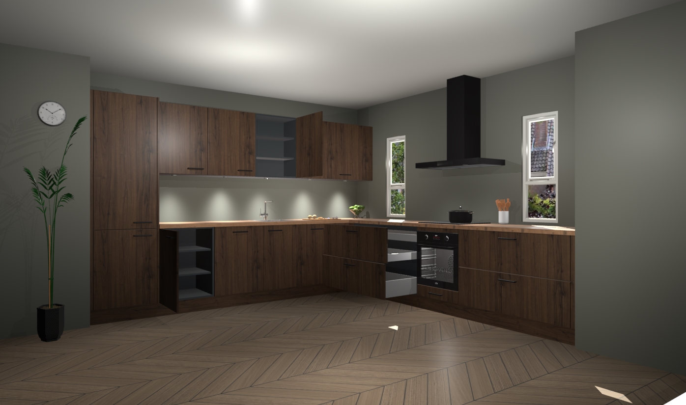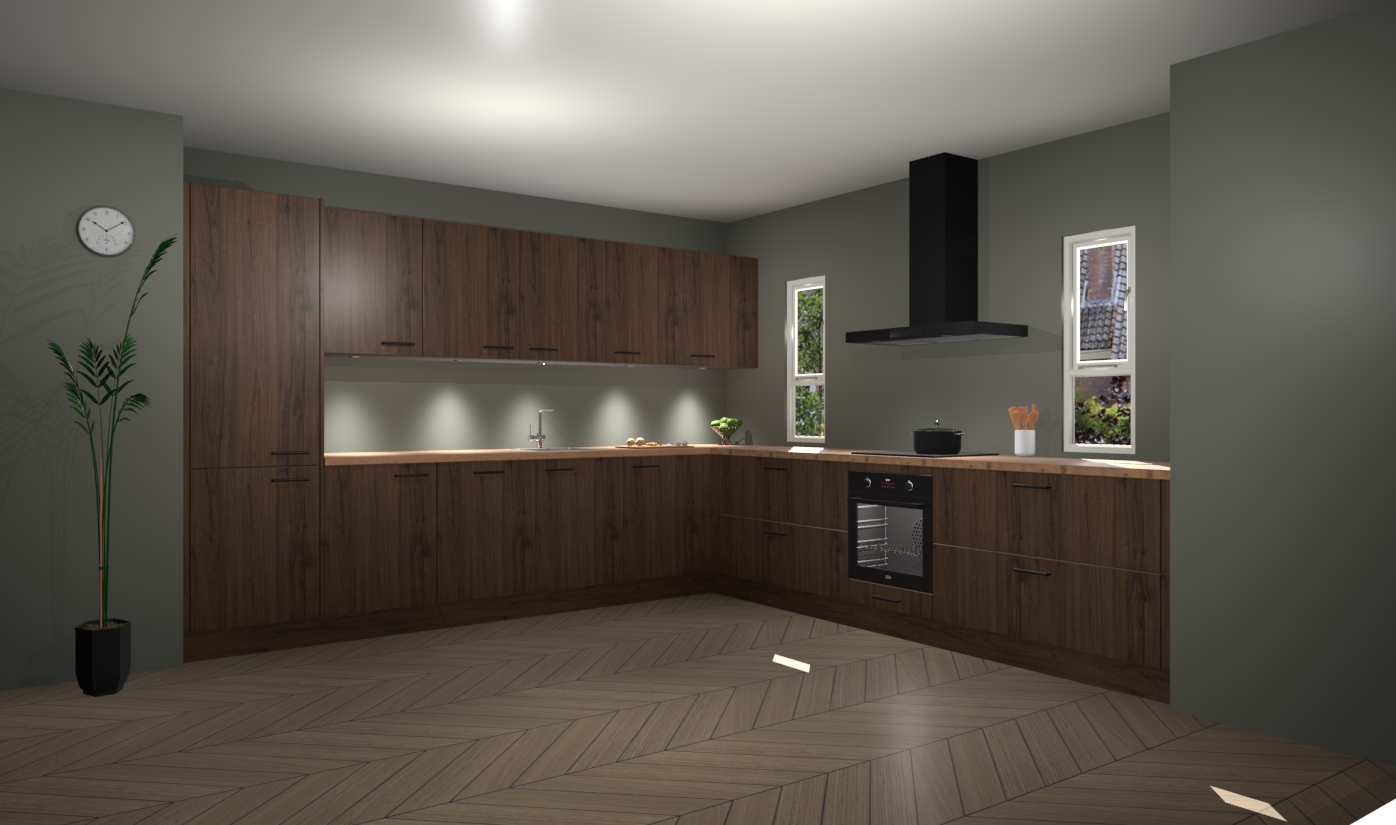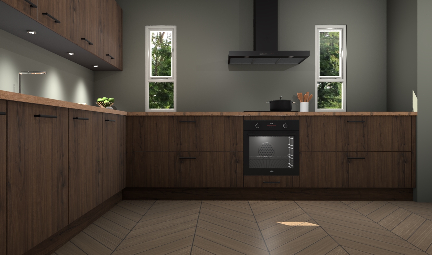 De noten keuken is een ideale hoekkeuken en heeft alle functies en apparatuur die u maar nodig kunt hebben. Bij de bestelling krijgt u een oven, inductiekookplaat, afzuigkap, vaatwasser en koelkast - deze kunnen desgewenst eenvoudig worden uitgebreid naar AEG na bestellen. Elke kast wordt ook voor gemonteerd geleverd met soft close deuren die jarenlang gebruik beloven. Stelt u zich voor dat u geen gedoe heeft met vervelende montage - vanaf het moment dat u uw bestelling plaats, duurt het slechts 7 weken voor het bij u thuis geleverd wordt.