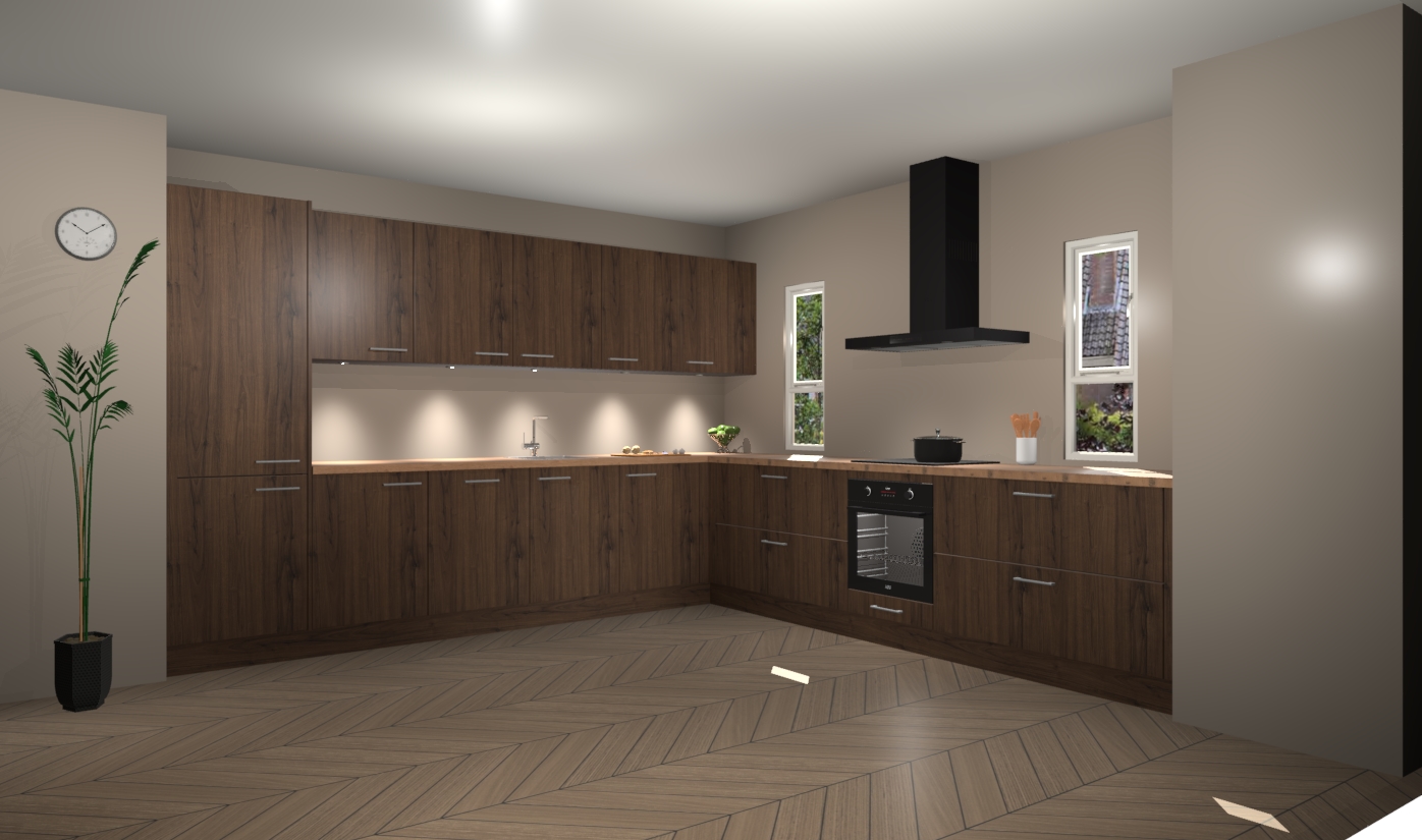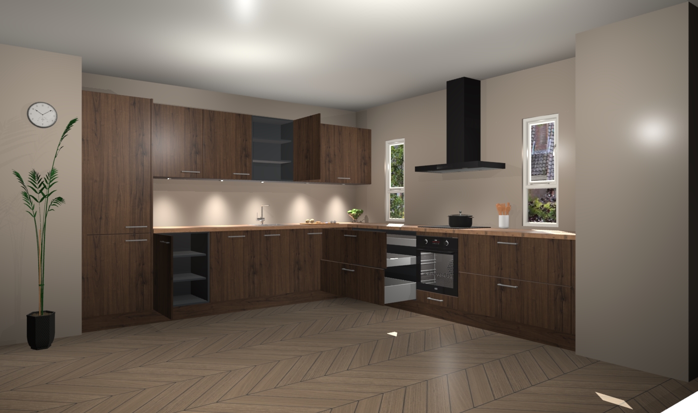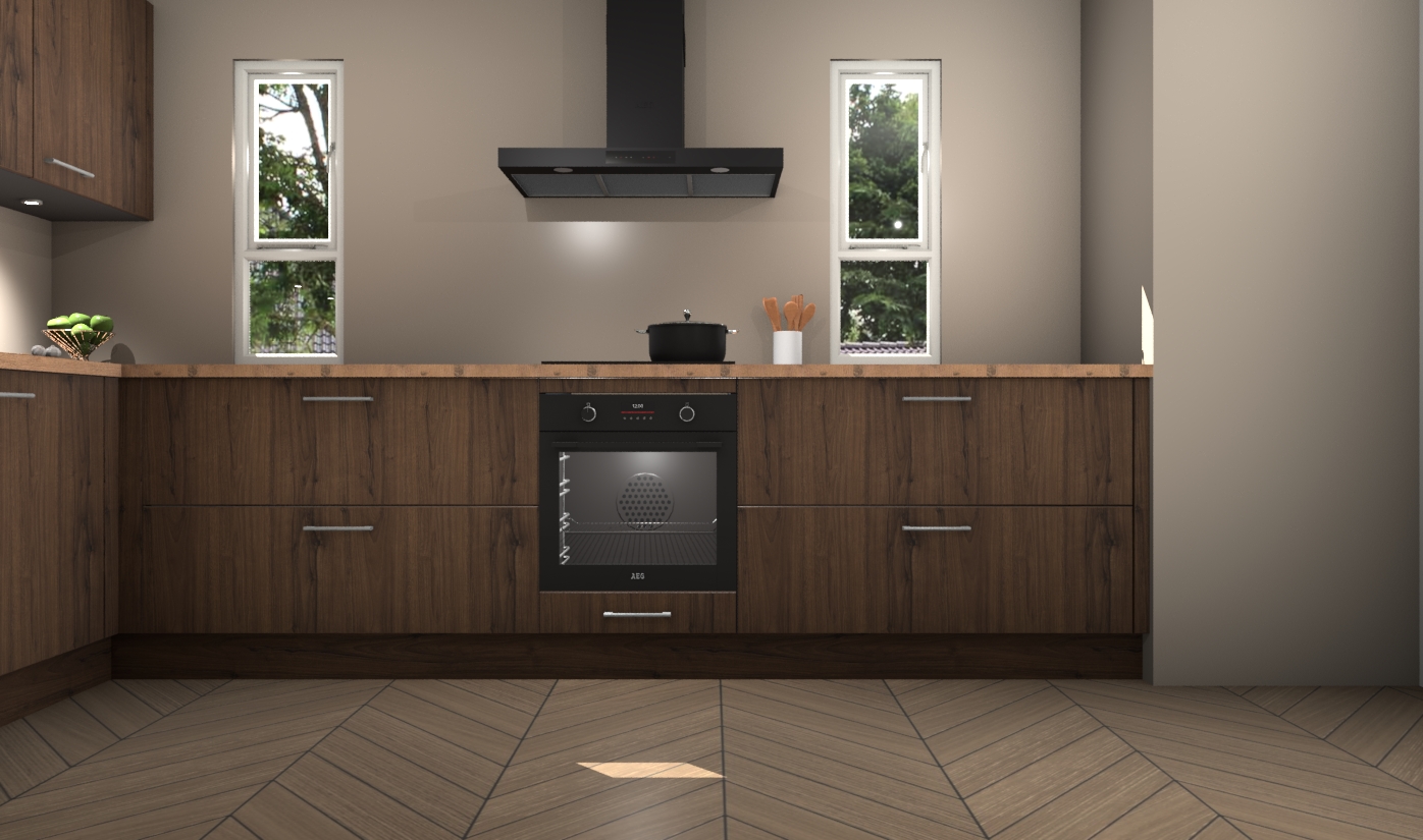 De noten keuken is een ideale hoekkeuken en heeft alle functies en apparatuur die u maar nodig kunt hebben. Bij de bestelling krijgt u een oven, inductiekookplaat, afzuigkap, vaatwasser en koelkast - deze kunnen desgewenst eenvoudig worden uitgebreid naar AEG na bestellen. Elke kast wordt ook voor gemonteerd geleverd met soft close deuren die jarenlang gebruik beloven. Stelt u zich voor dat u geen gedoe heeft met vervelende montage - vanaf het moment dat u uw bestelling plaats, duurt het slechts 7 weken voor het bij u thuis geleverd wordt.