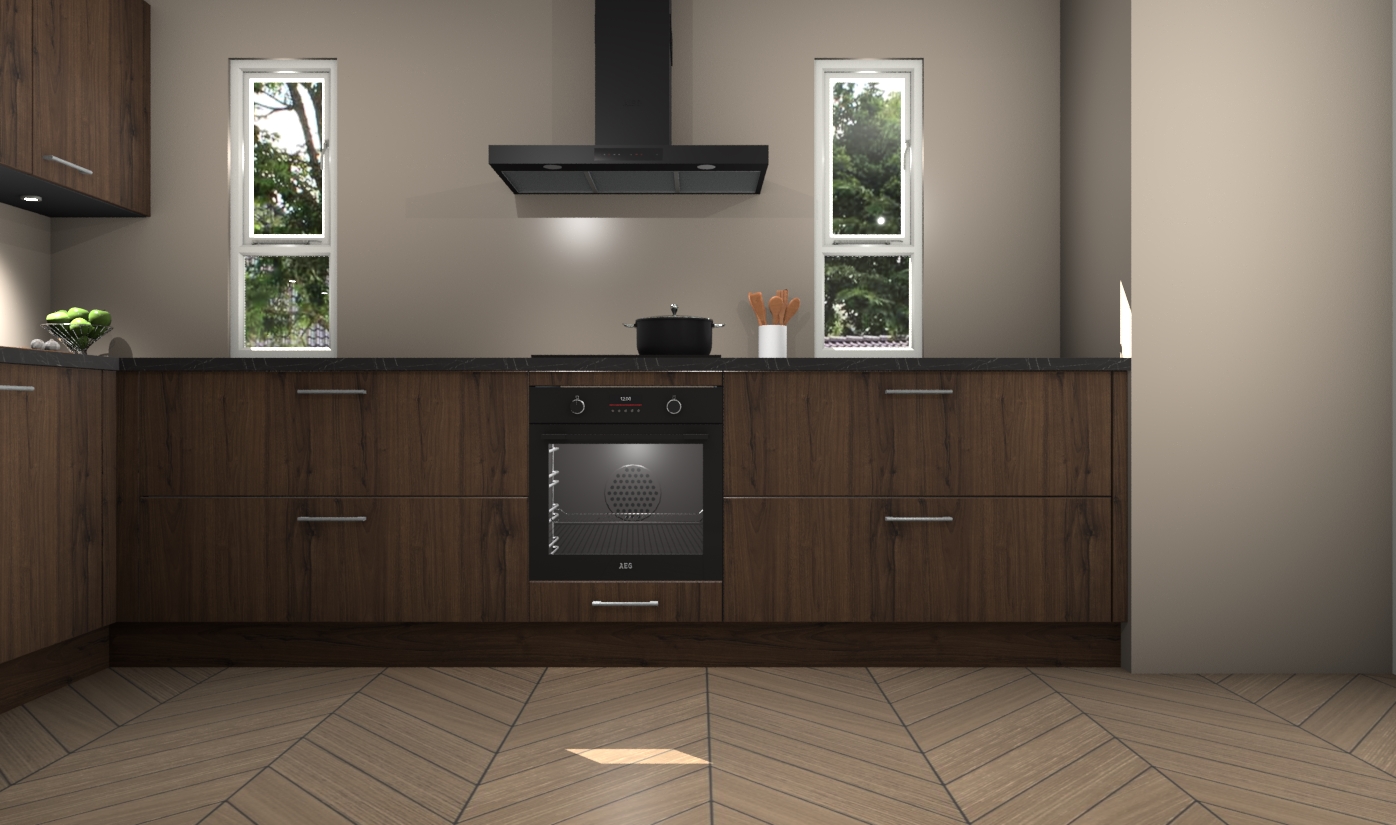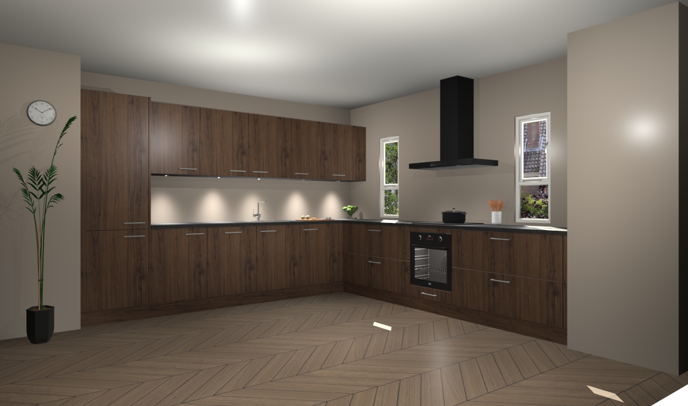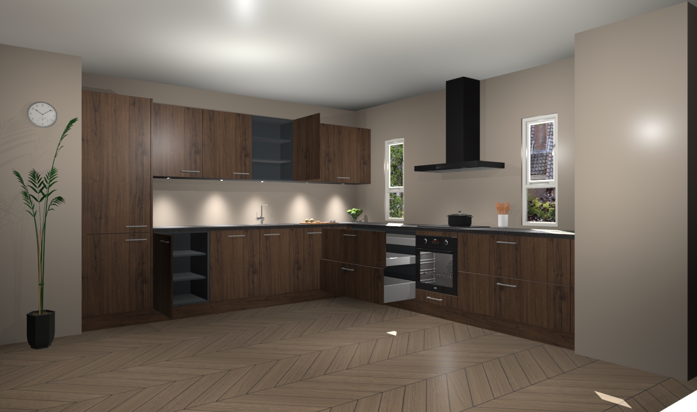 De noten keuken is een ideale hoekkeuken en heeft alle functies en apparatuur die u maar nodig kunt hebben. Bij de bestelling krijgt u een oven, inductiekookplaat, afzuigkap, vaatwasser en koelkast - deze kunnen desgewenst eenvoudig worden uitgebreid naar AEG na bestellen. Elke kast wordt ook voor gemonteerd geleverd met soft close deuren die jarenlang gebruik beloven. Stelt u zich voor dat u geen gedoe heeft met vervelende montage - vanaf het moment dat u uw bestelling plaats, duurt het slechts 7 weken voor het bij u thuis geleverd wordt.