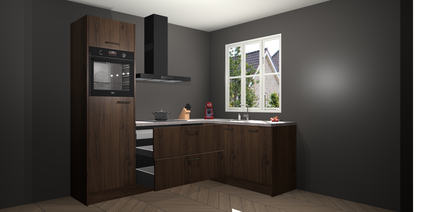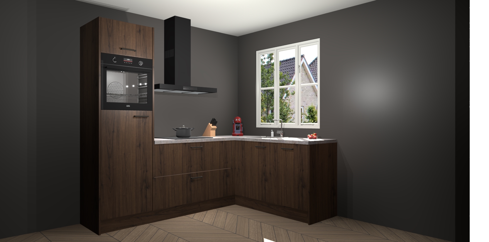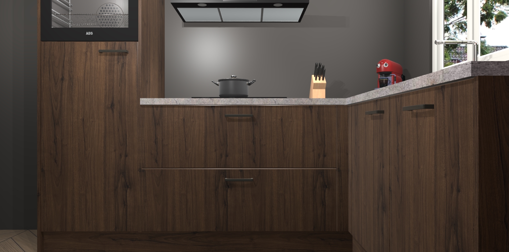 Dit model biedt u voldoende opbergruimte en vijf ingebouwde apparaten: een oven, inductiekookplaat, afzuigkap, vaatwasser en koelkast. Deze apparaten kunnen gemakkelijk worden geüpgrade naar AEG nadat u besteld heeft. De verschillende laden en kastjes bevatten softclose-deuren waardoor ze gezellig dichtvallen met een geruststellend helemaal geruisloos geluid. En dat is nog niet alles! We garanderen ook dat de prijs altijd laag blijft - dus haal nu uw Noten keuken Victoria terwijl het kan.