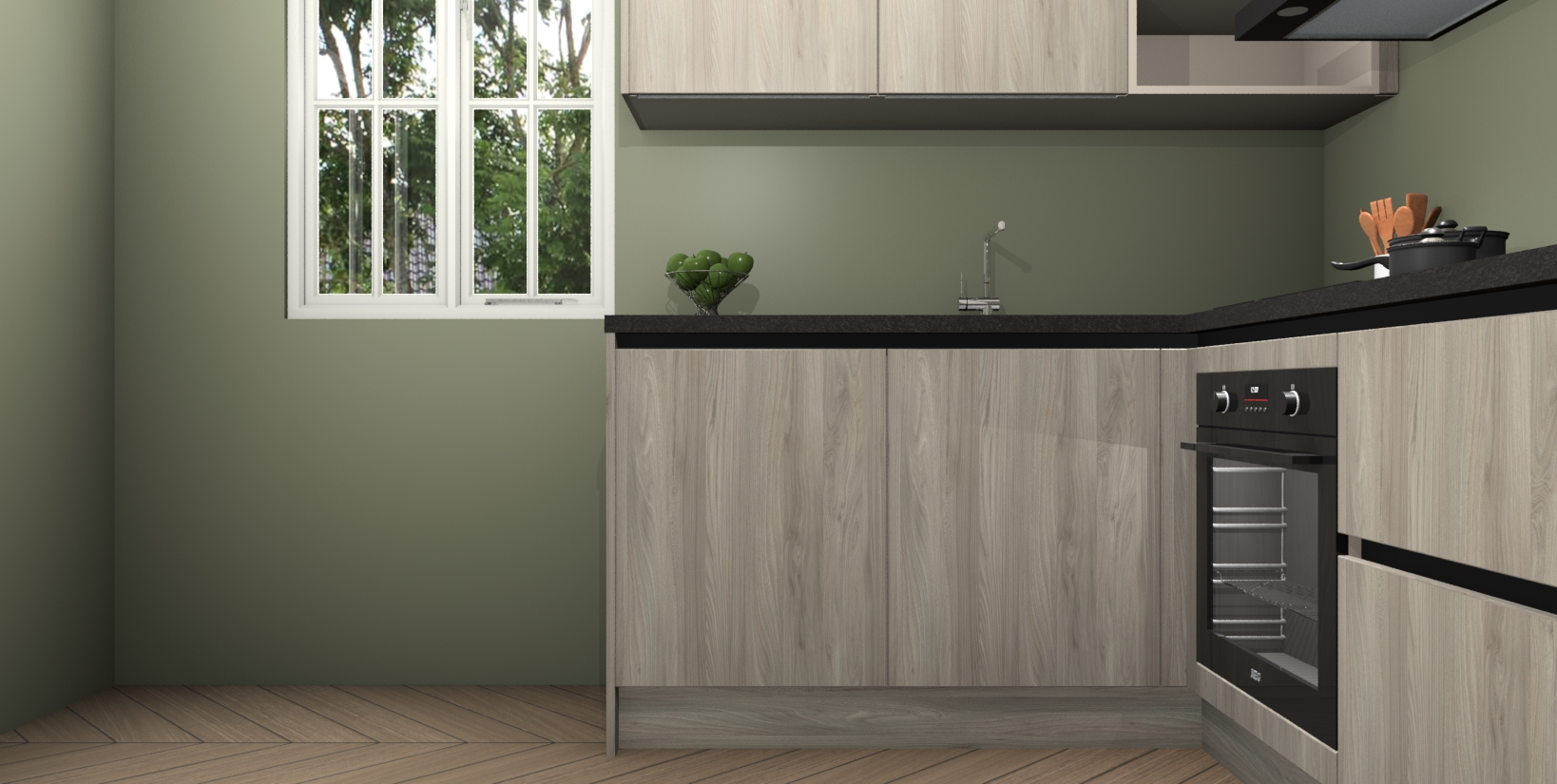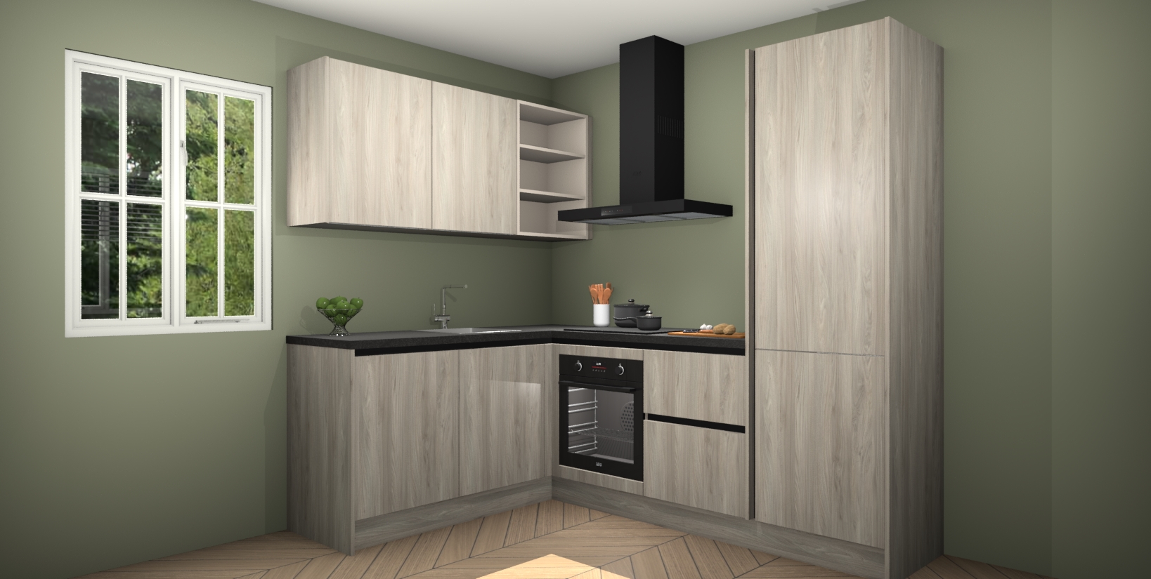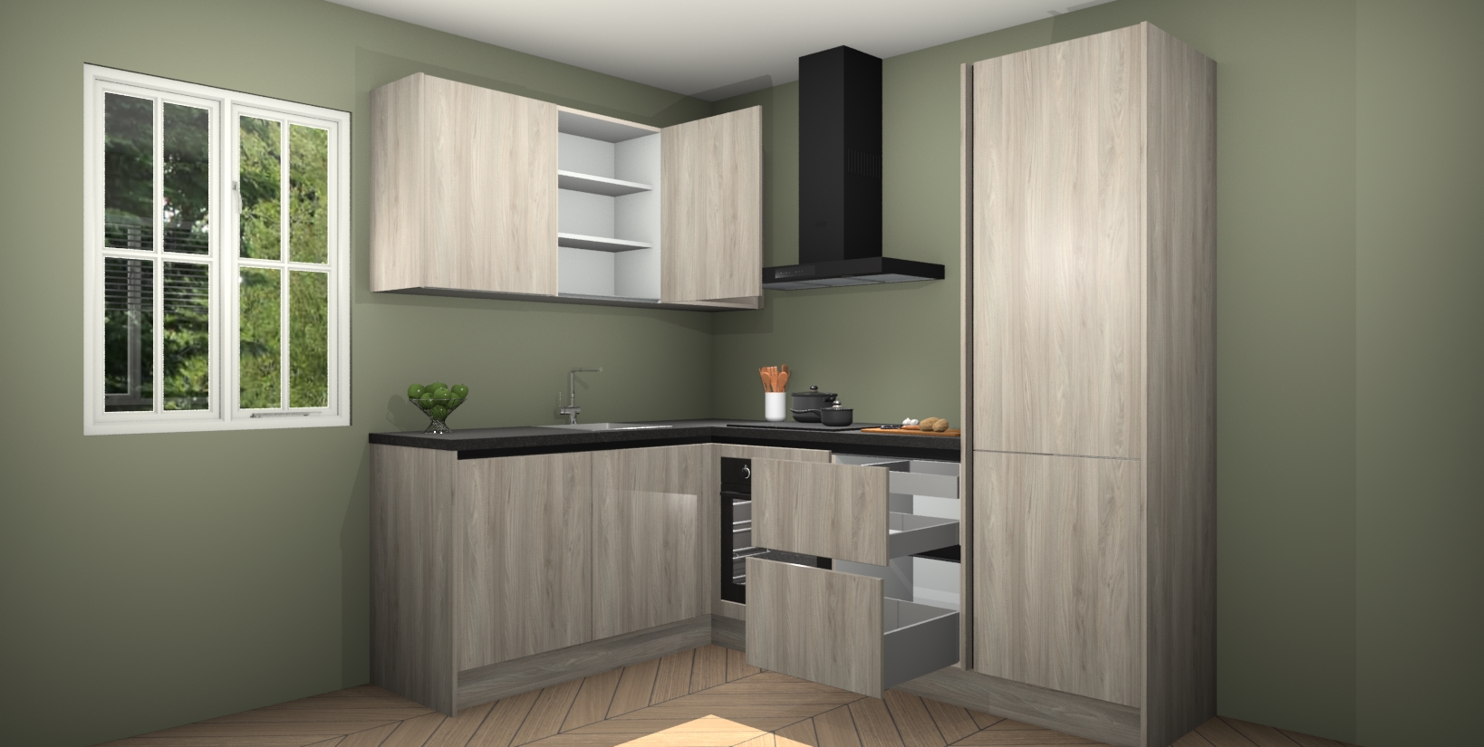 Maak kennis met de Olm greeploze keuken Boekarest, een moderne hoekkeuken waar al uw vrienden en familie jaloers op zullen zijn! Het verbluffende mooie ontwerp past in elk interieur en is een ideale keuze voor wie op zoek is naar een klassieke, maar verfijnde look.