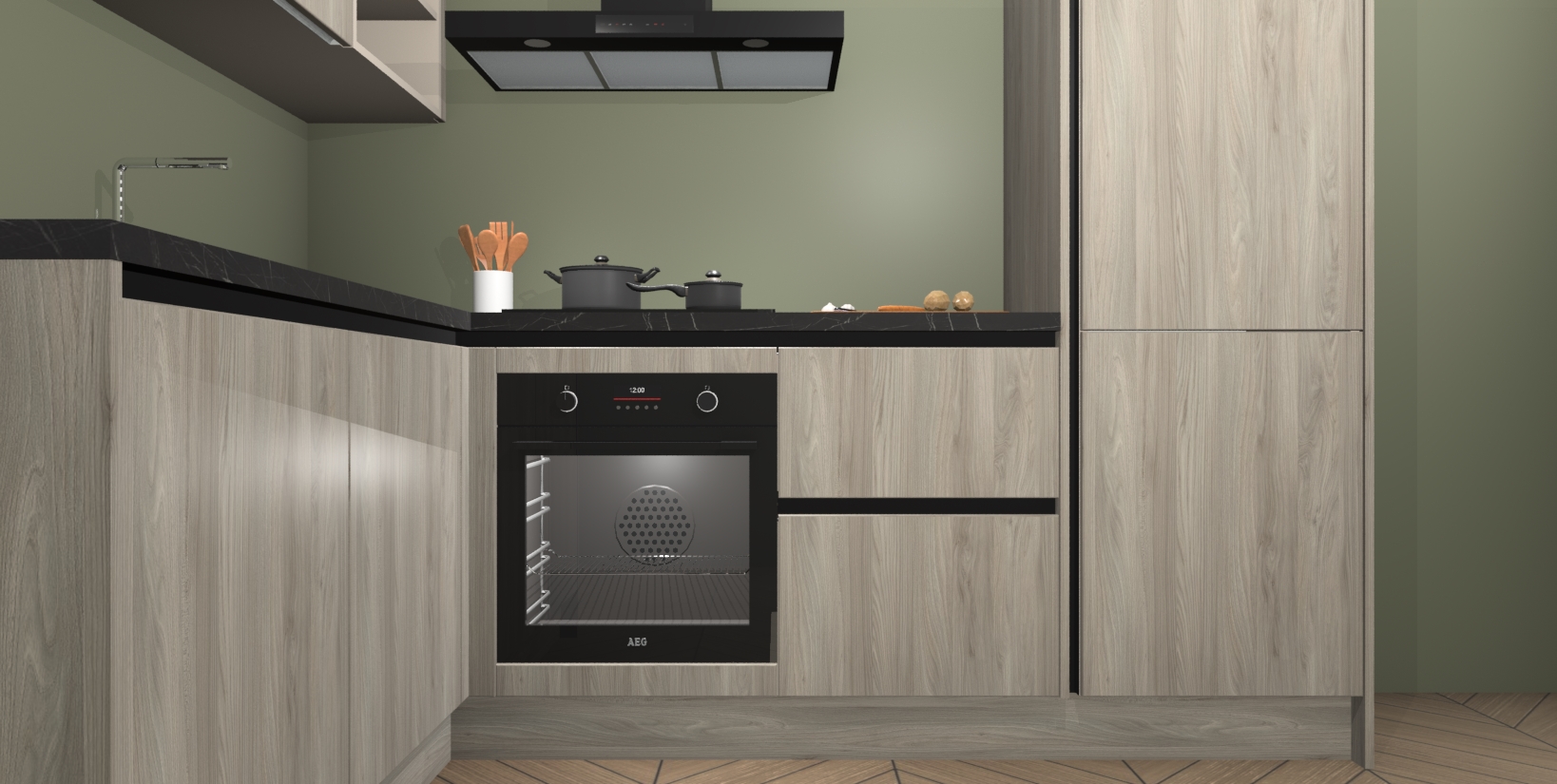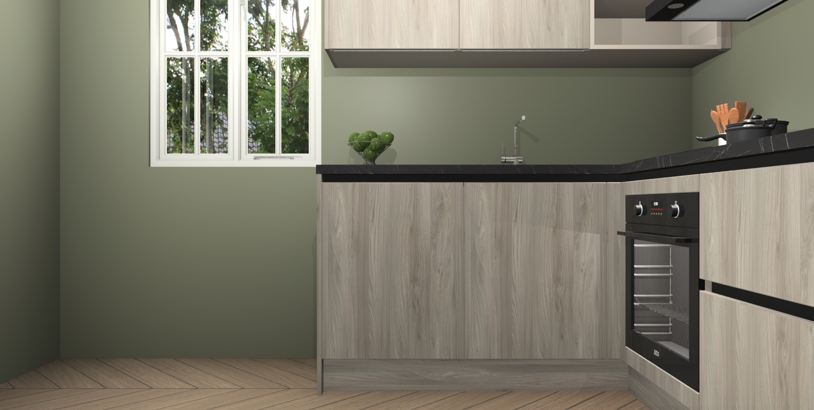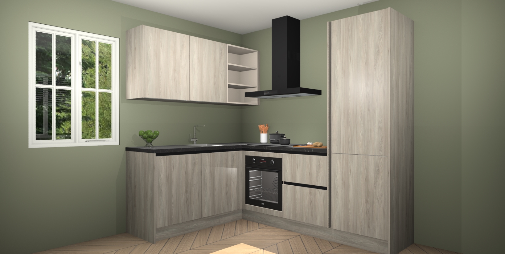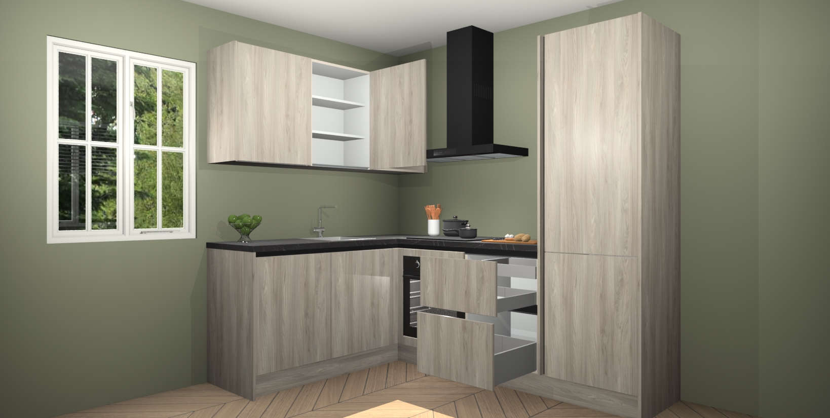 Maak kennis met de Olm greeploze keuken Boekarest, een moderne hoekkeuken waar al uw vrienden en familie jaloers op zullen zijn! Het verbluffende mooie ontwerp past in elk interieur en is een ideale keuze voor wie op zoek is naar een klassieke, maar verfijnde look.
