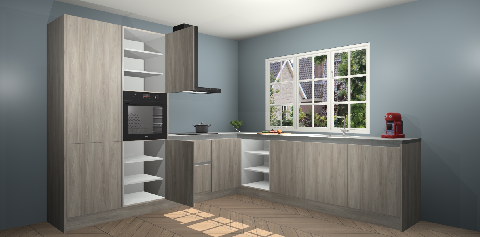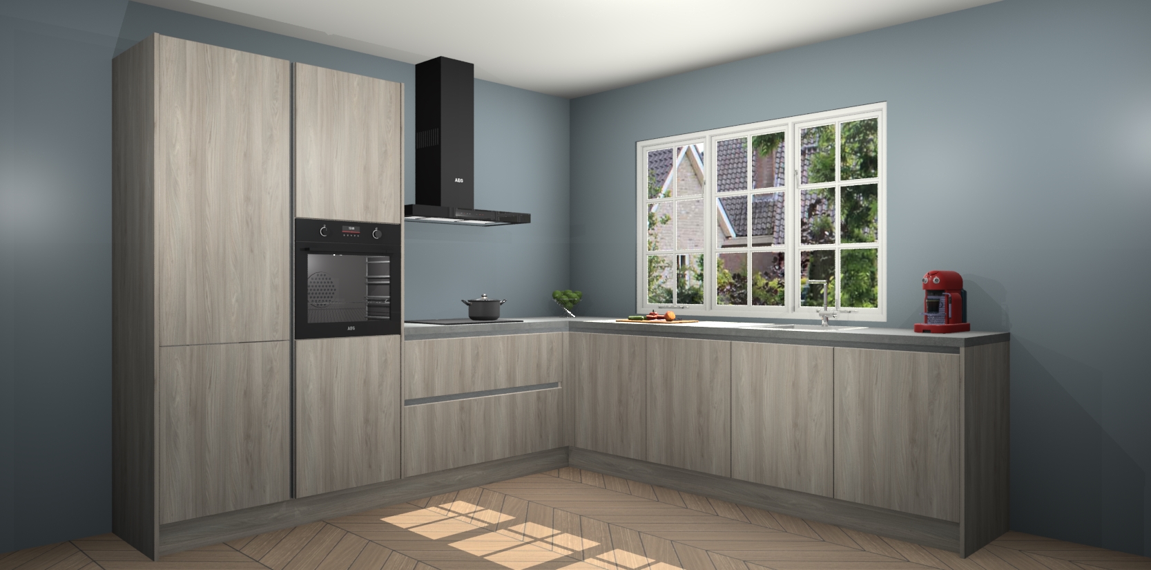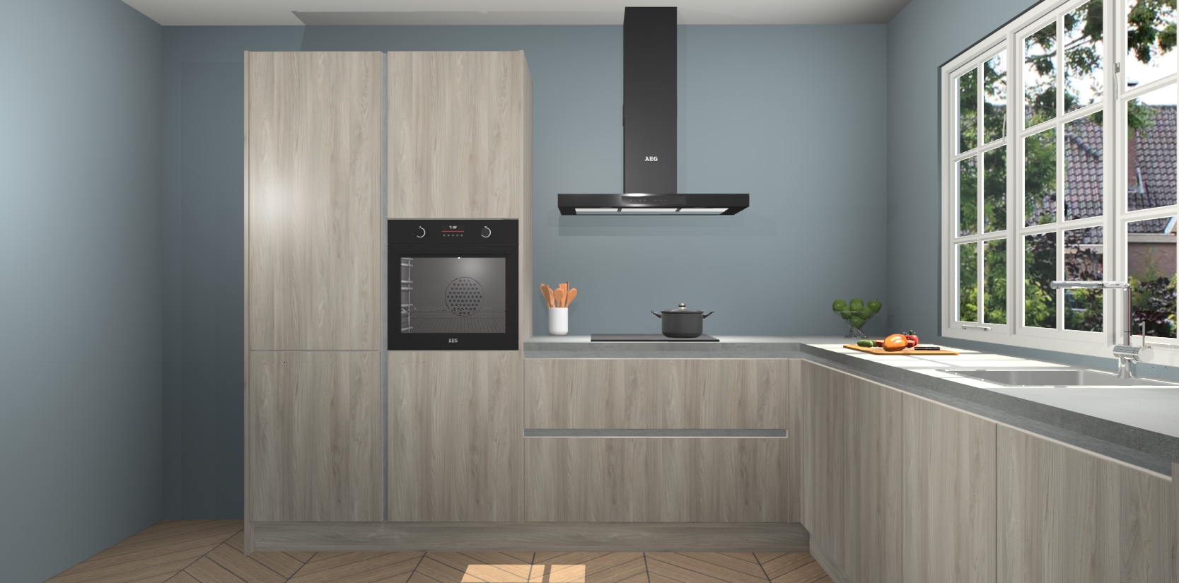 De keuken heeft veel opbergruimte, waardoor u alle ingrediënten gemakkelijk bereikbaar hebt staan. En daarnaast bevat deze volledig uitgeruste keuken ook 5 ingebouwde apparaten: een oven, inductiekookplaat, afzuigkap, vaatwasser en koelkast. Deze zijn heel eenvoudig na bestellen te upgraden naar AEG als u dit wilt. Bovendien zijn de softclose-kastdeuren ideaal; geef ze gewoon even een tikje en ze sluiten automatisch met geruisloze precisie.