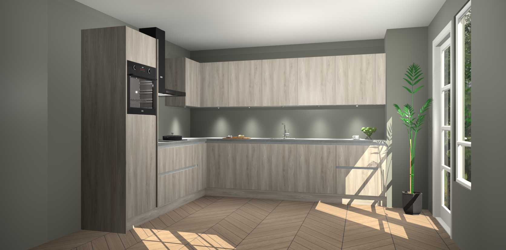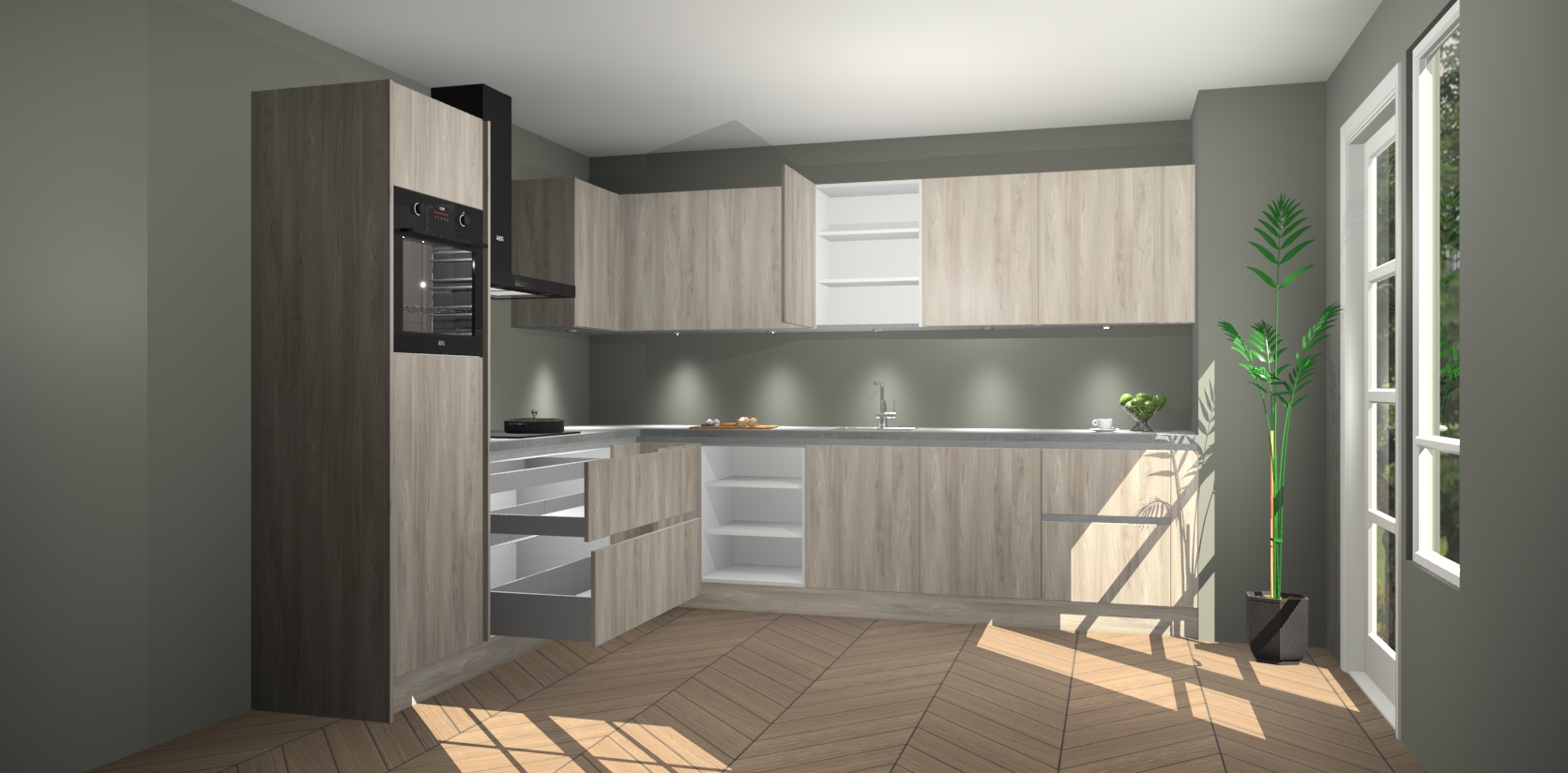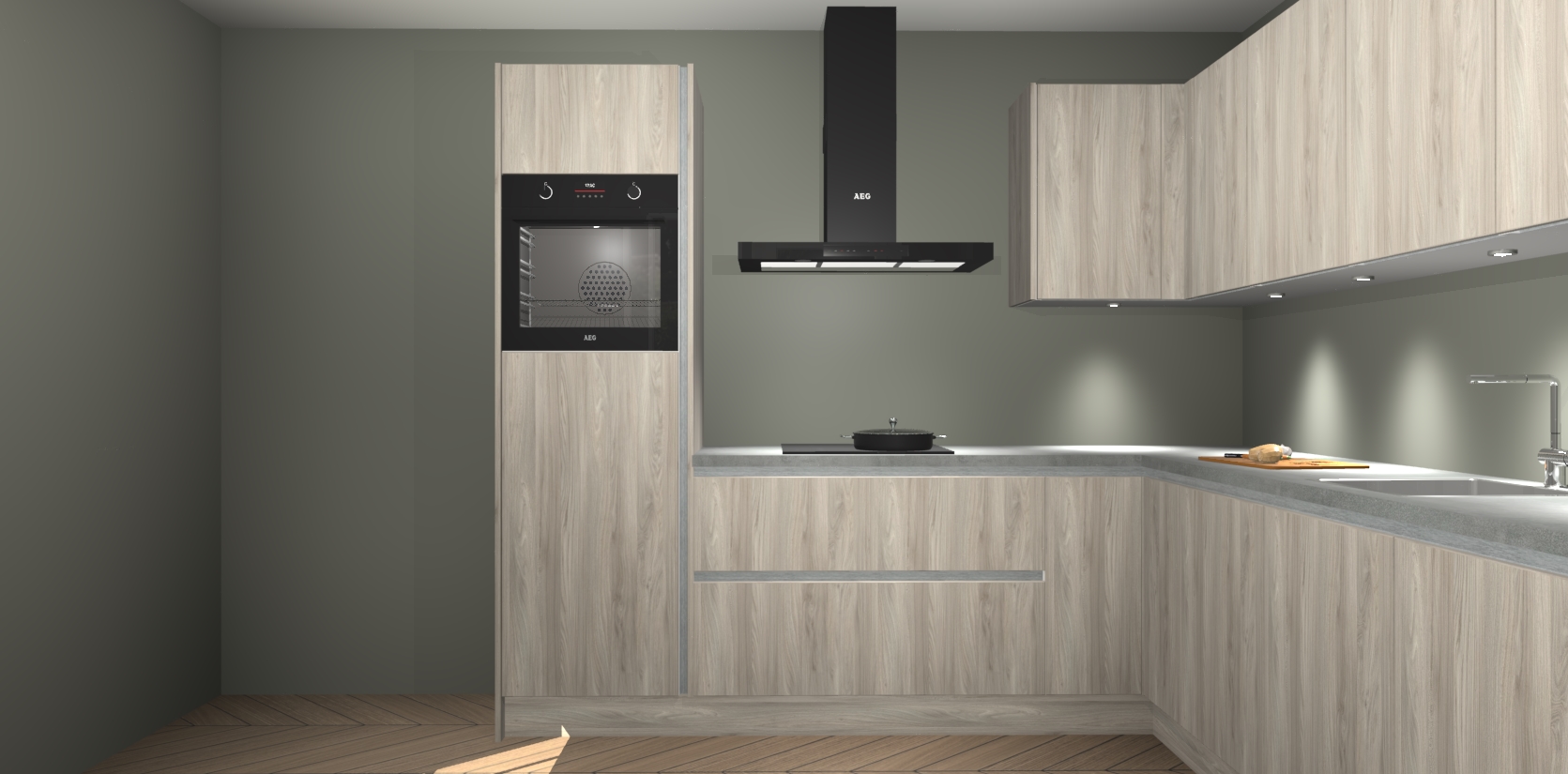 De Olm greeploze keuken Debar is uitgerust met vijf inbouwapparaten die elke kooktaak handig en efficiënt maken. Een oven, inductiekookplaat, afzuigkap, vaatwasser en koelkast zijn standaard, maar kunnen na bestelling eenvoudig worden geupgrade naar AEG. Profiteer vervolgens van de softclose deuren voor snelle toegang en geruisloze toegang.