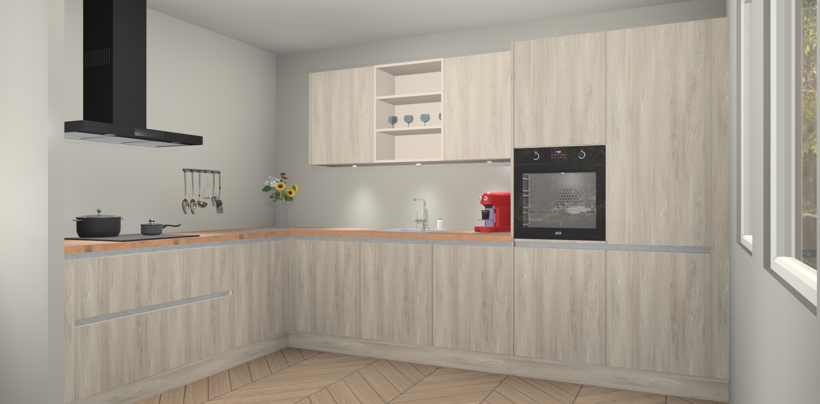 De Olm greeploze keuken Gotenburg is zo ontworpen dat u alle mogelijke vormen van opslagruimte kunt genieten. Bovendien heeft u meteen toegang tot vijf ingebouwde apparaten: een oven, inductiekookplaat, afzuigkap, vaatwasser en koelkast. Gewoon upgraden naar AEG na bestelling? Dit kan heel gemakkelijk worden geregeld. De deuren sluiten zacht dankzij zachtsluitende scharnieren en ze houden warmte vast terwijl ze uitzonderlijk stil blijven wanneer ze worden geopend of gesloten.