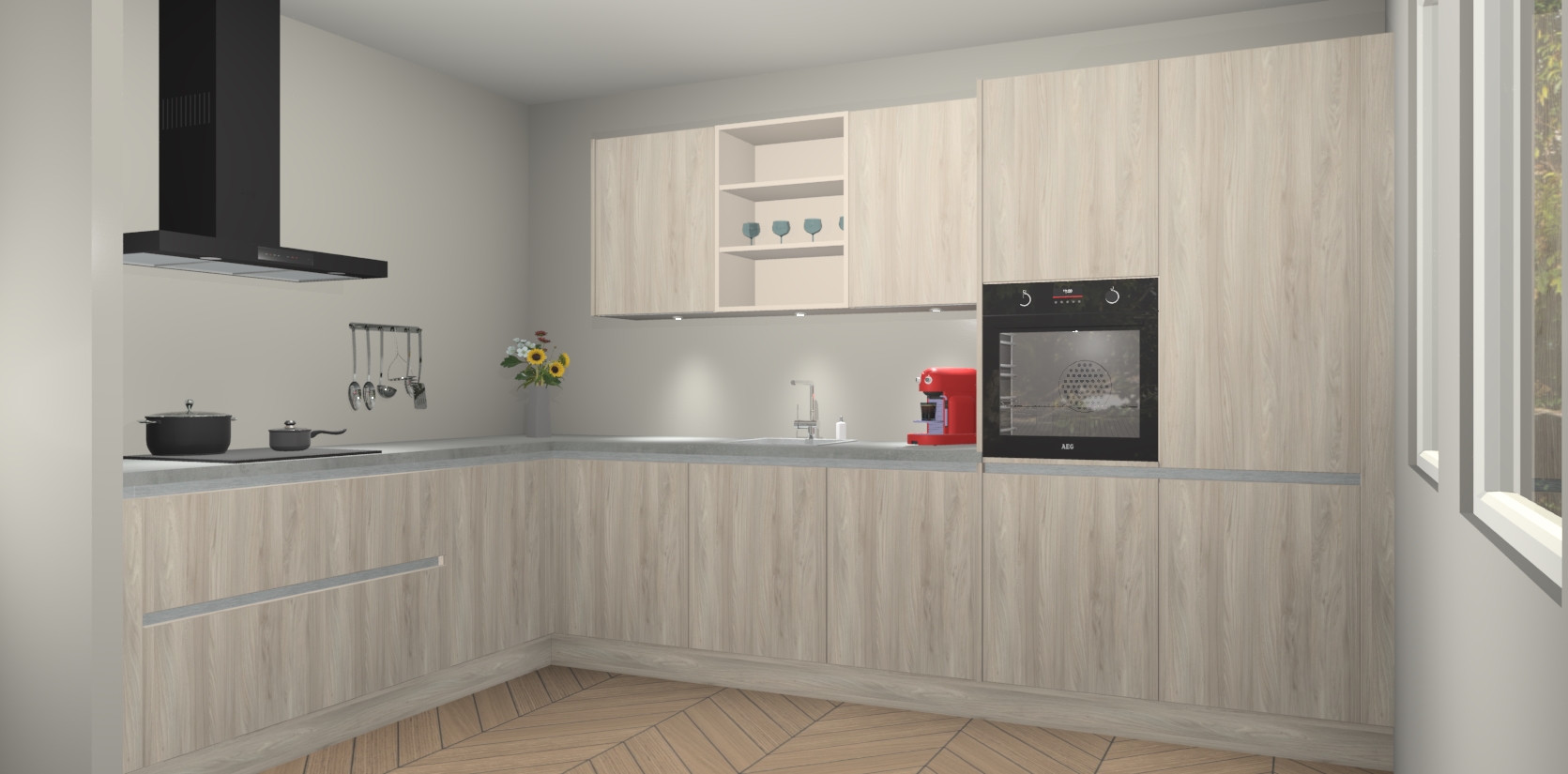 De Olm greeploze keuken Gotenburg is zo ontworpen dat u alle mogelijke vormen van opslagruimte kunt genieten. Bovendien heeft u meteen toegang tot vijf ingebouwde apparaten: een oven, inductiekookplaat, afzuigkap, vaatwasser en koelkast. Gewoon upgraden naar AEG na bestelling? Dit kan heel gemakkelijk worden geregeld. De deuren sluiten zacht dankzij zachtsluitende scharnieren en ze houden warmte vast terwijl ze uitzonderlijk stil blijven wanneer ze worden geopend of gesloten.