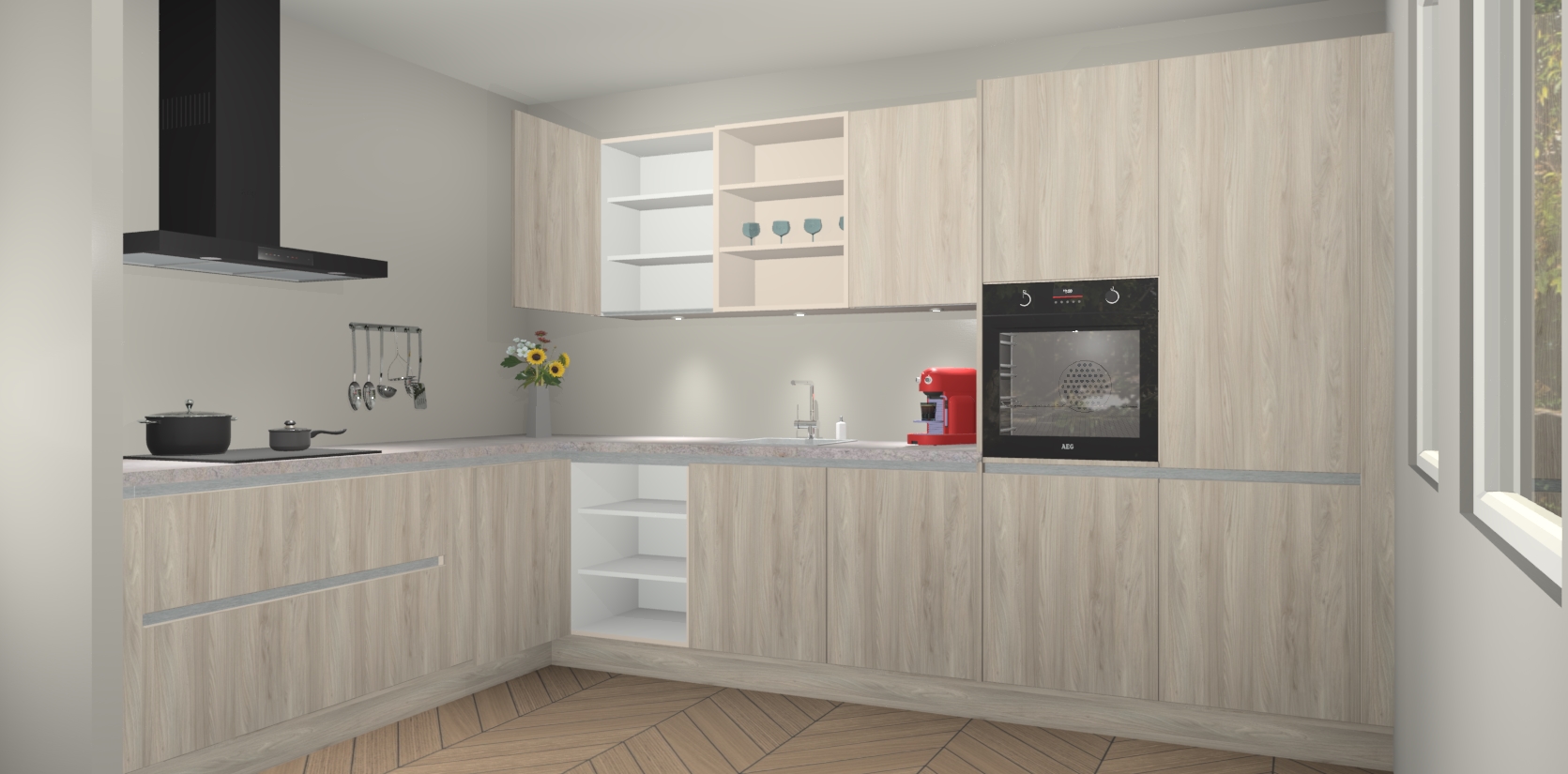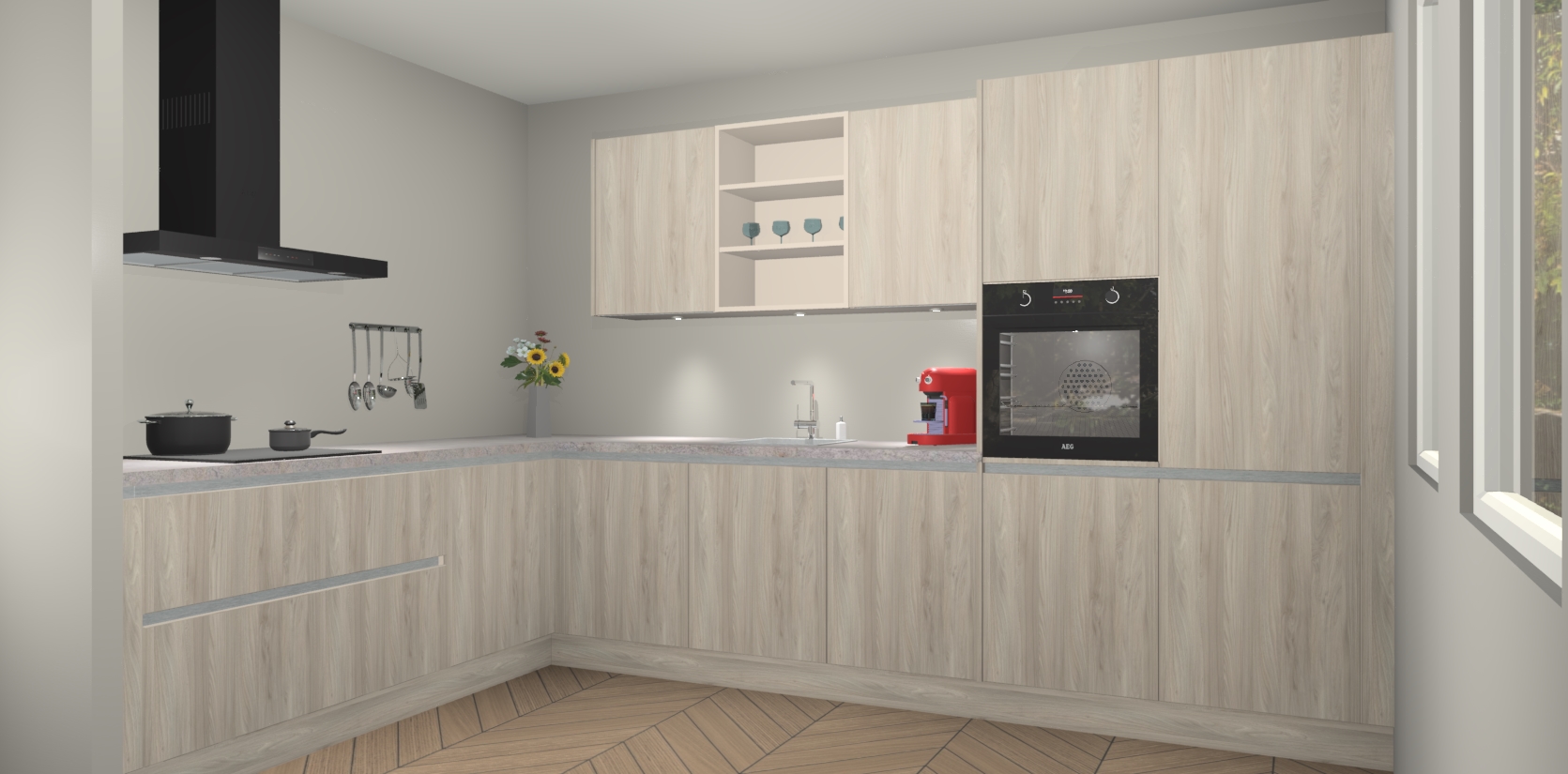 De Olm greeploze keuken Gotenburg is zo ontworpen dat u alle mogelijke vormen van opslagruimte kunt genieten. Bovendien heeft u meteen toegang tot vijf ingebouwde apparaten: een oven, inductiekookplaat, afzuigkap, vaatwasser en koelkast. Gewoon upgraden naar AEG na bestelling? Dit kan heel gemakkelijk worden geregeld. De deuren sluiten zacht dankzij zachtsluitende scharnieren en ze houden warmte vast terwijl ze uitzonderlijk stil blijven wanneer ze worden geopend of gesloten.
