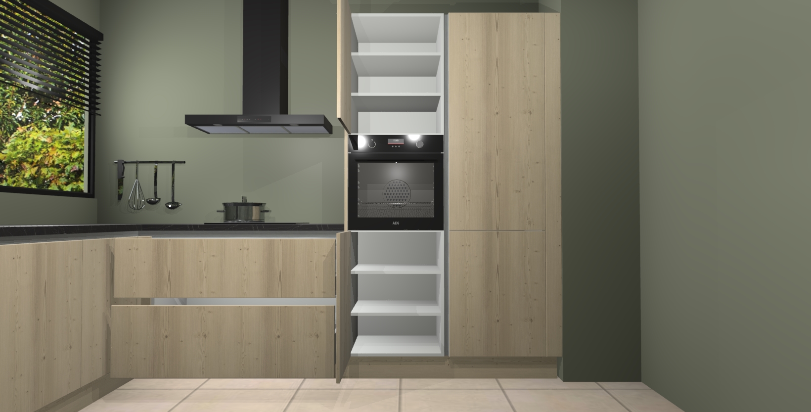 Met een modern, tijdloos design en ruime opslagruimte, zult u zich in no-time thuis voelen in uw nieuwe keuken. Uw leven wordt eenvoudiger met de soft-close deuren die voor het ultieme stille comfort zorgen - geen geluid dat u stoort terwijl u kookt. Ook is de keuken voorzien van 5 ingebouwde apparaten: een oven, inductie kookplaat, afzuigkap, vaatwasser en koelkast. Deze kunnen gemakkelijk na bestelling worden bijgewerkt naar AEG - waardoor uw luxe ervaring compleet is.