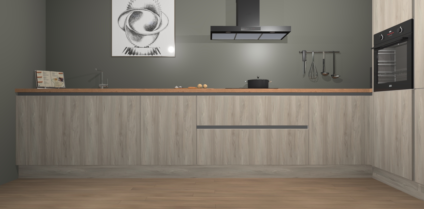 Welkom bij de Olm greeploze keuken Khao Lak. Deze prachtige keuken zal de komende jaren het middelpunt van de belangstelling in uw huis zijn. Uitgerust met vijf inbouwapparaten komt u nooit kookgereedschap tekort. Bovendien geeft de warme houtlook elke ruimte een uitnodigende en tijdloze uitstraling.