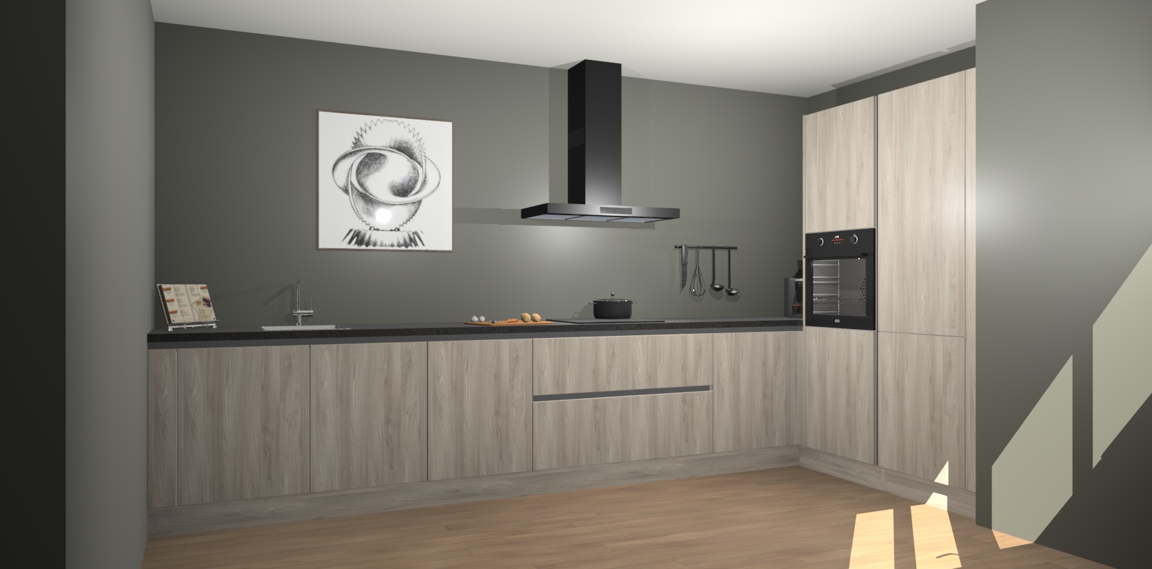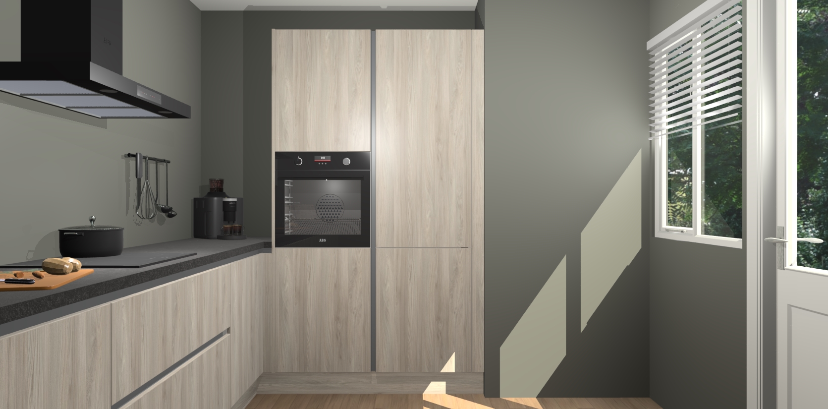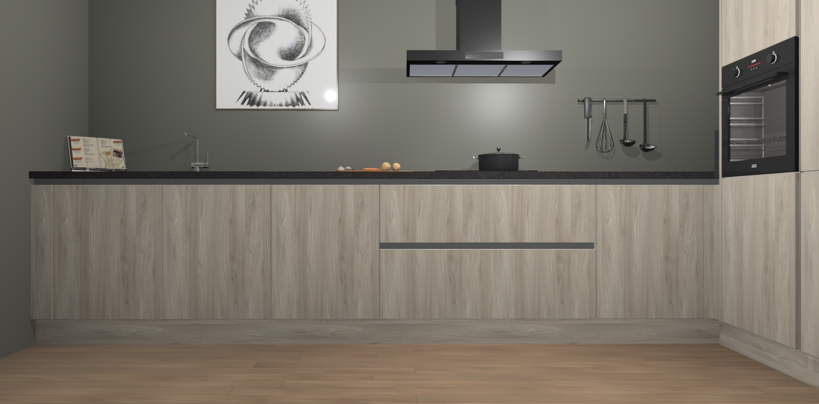 Welkom bij de Olm greeploze keuken Khao Lak. Deze prachtige keuken zal de komende jaren het middelpunt van de belangstelling in uw huis zijn. Uitgerust met vijf inbouwapparaten komt u nooit kookgereedschap tekort. Bovendien geeft de warme houtlook elke ruimte een uitnodigende en tijdloze uitstraling.