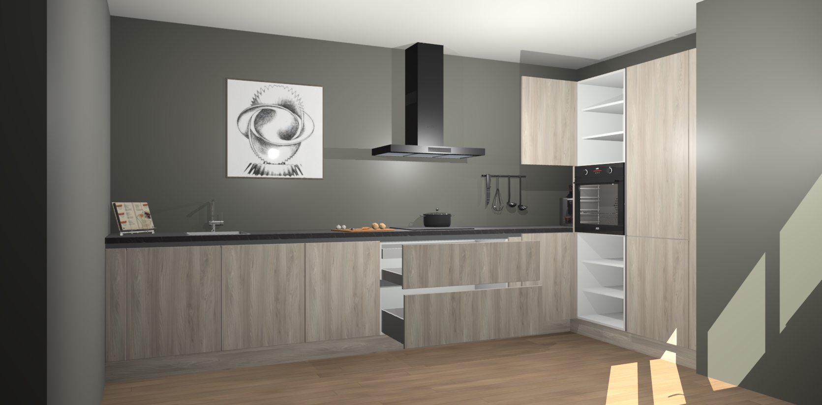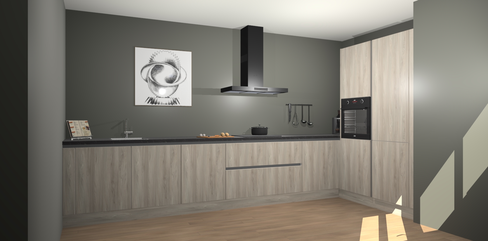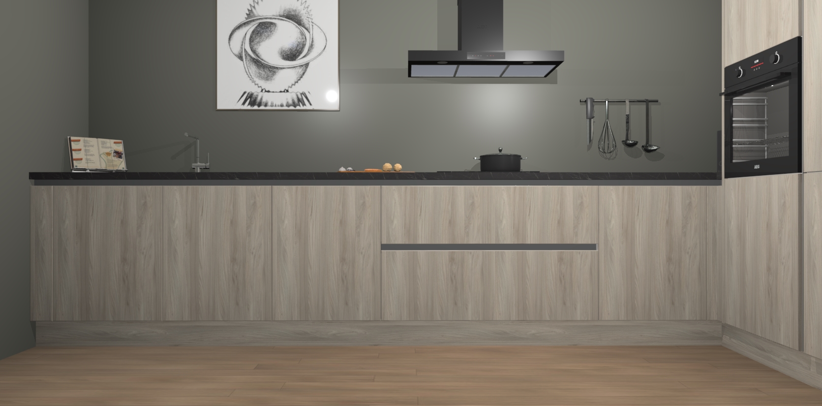 Welkom bij de Olm greeploze keuken Khao Lak. Deze prachtige keuken zal de komende jaren het middelpunt van de belangstelling in uw huis zijn. Uitgerust met vijf inbouwapparaten komt u nooit kookgereedschap tekort. Bovendien geeft de warme houtlook elke ruimte een uitnodigende en tijdloze uitstraling.
