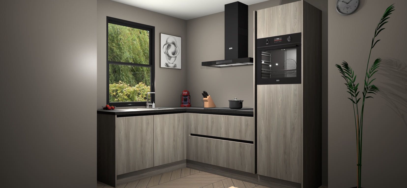 Deze prachtige hoekkeuken heeft alle benodigdheden om uw droomkook- en eetruimte compleet te maken. De Olm kasten bieden een echo van raffinement, terwijl de 5 inbouwapparaten genoeg opties bieden voor het bereiden van heerlijke maaltijden. De oven, inductiekookplaat, afzuigkap, vaatwasser en koelkast zorgen ervoor dat u tijd in de keuken zo efficiënt mogelijk verloopt, terwijl ze ook dat extra vleugje luxe bieden.