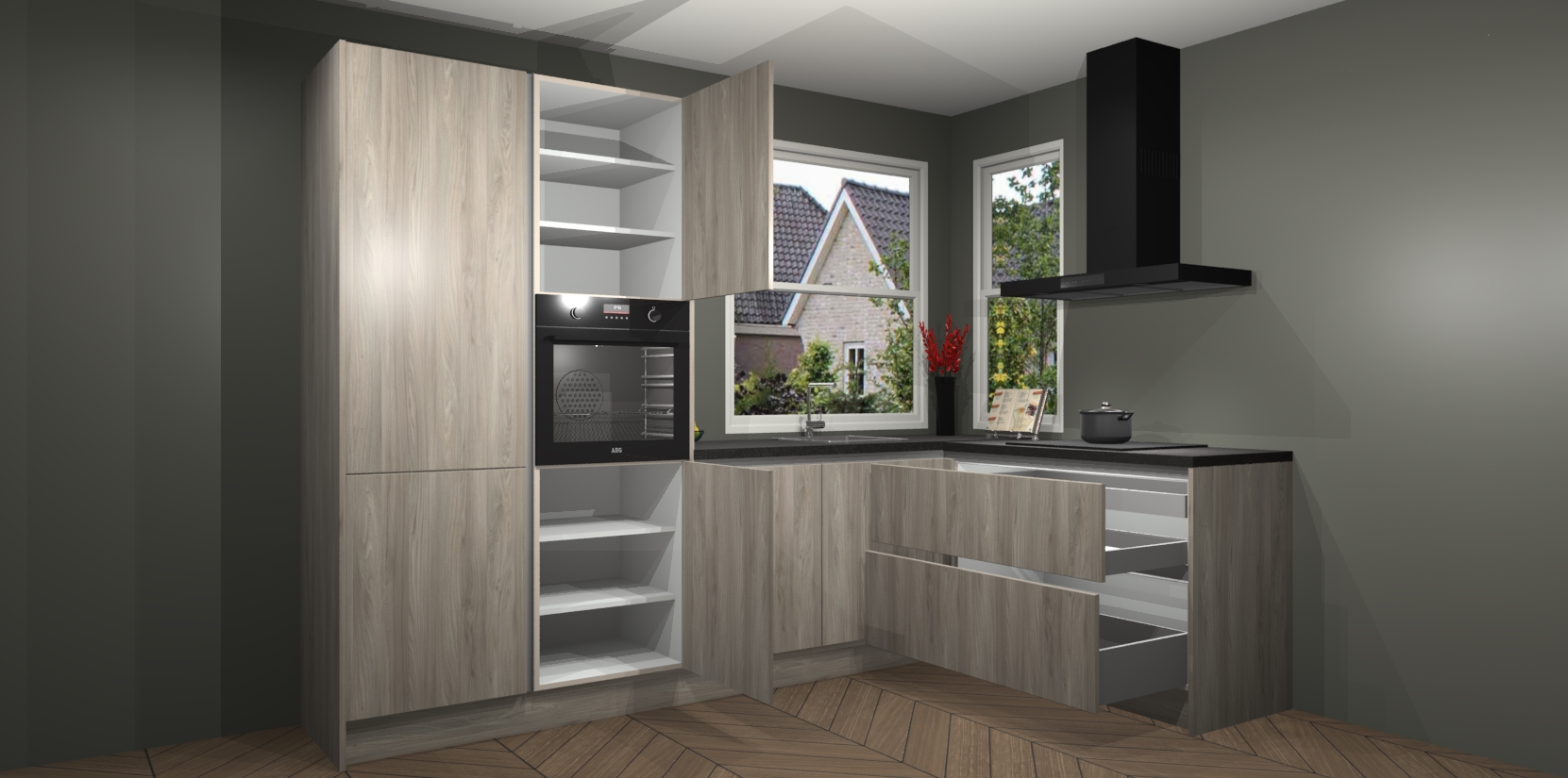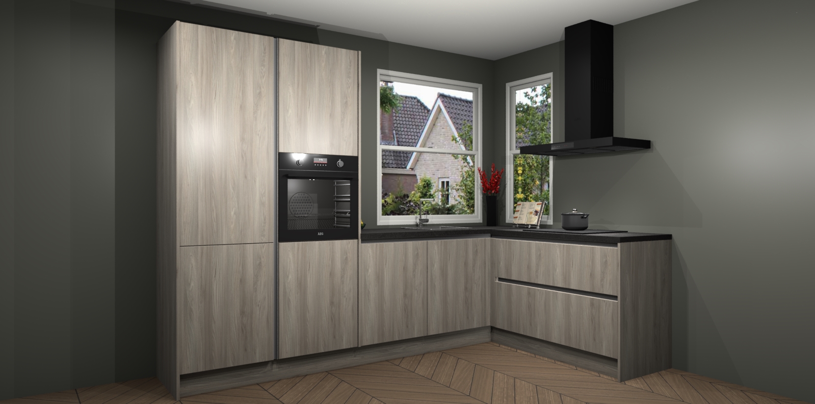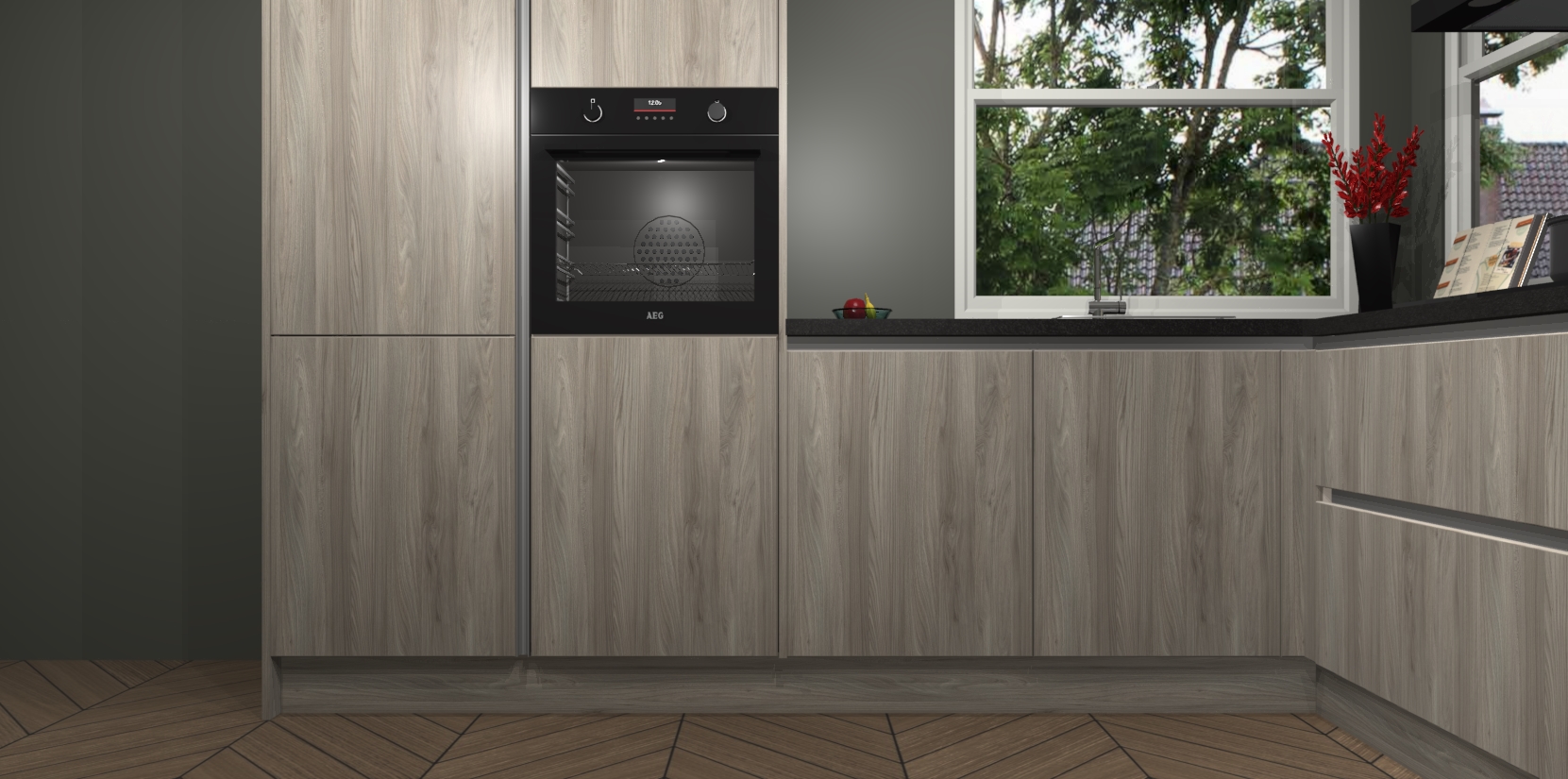 De Olm greeploze keuken Kotor wordt geleverd met vijf inbouwapparaten, waaronder een oven, inductiekookplaat, afzuigkap, vaatwasser en koelkast. En als u uw apparatuur wilt upgraden, kunnen we u na bestelling eenvoudig helpen overstappen naar AEG. Bovendien heeft deze keuken soft close deuren, zodat lades en kastjes geruisloos en zonder klepperen sluiten!