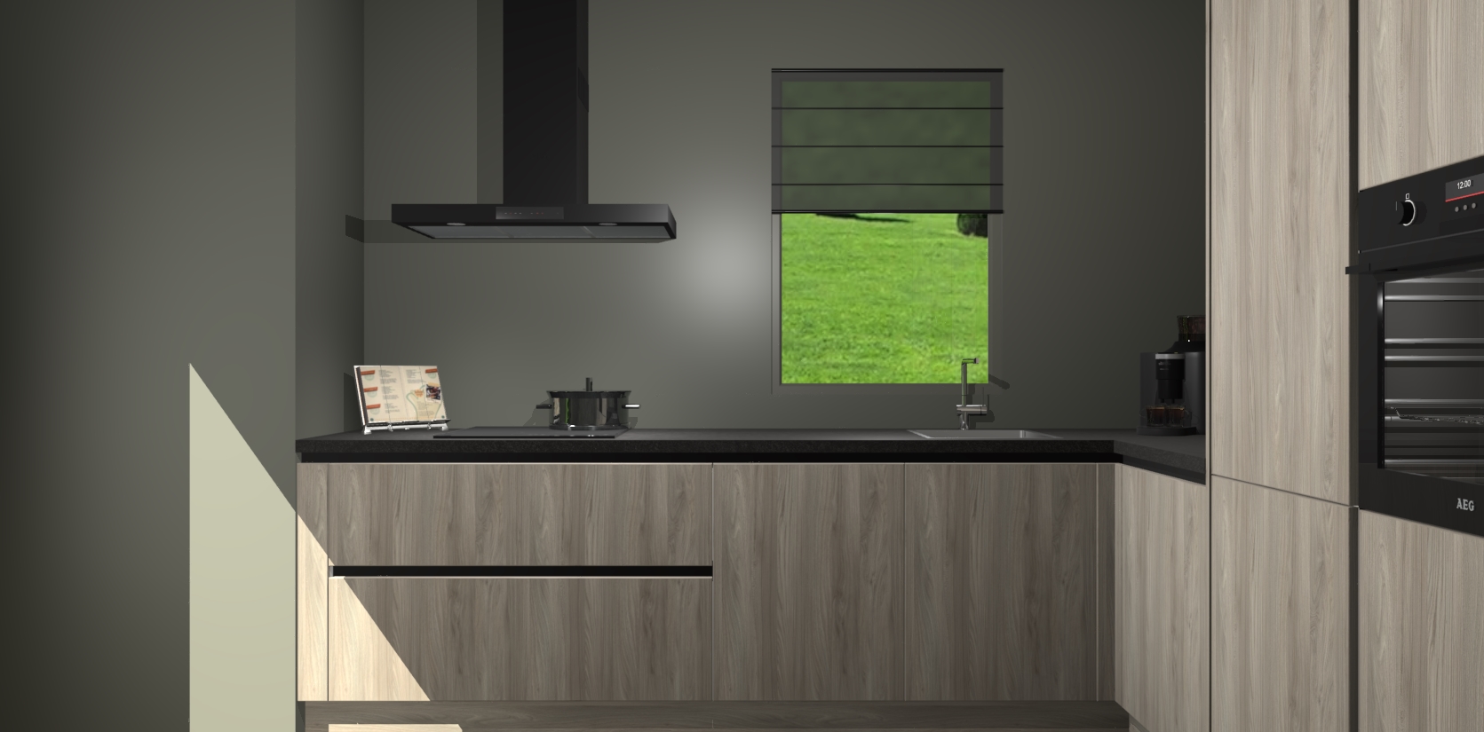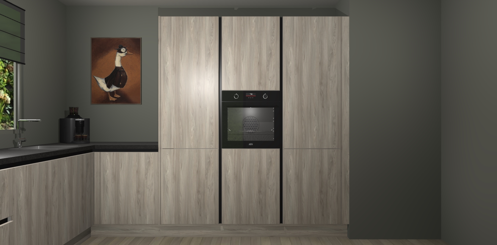 Welkom bij de Olm greeploze keuken Laos. Deze prachtige keuken zal de komende jaren het middelpunt van de belangstelling in uw huis zijn. Uitgerust met vijf inbouwapparaten komt u nooit kookgereedschap tekort. Bovendien geeft de warme houtlook elke ruimte een uitnodigende en tijdloze uitstraling.