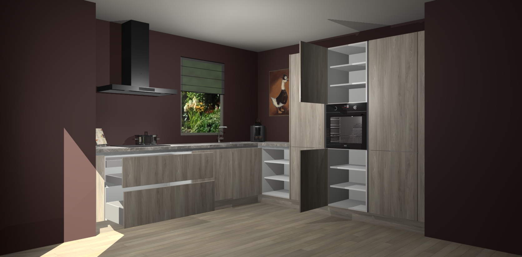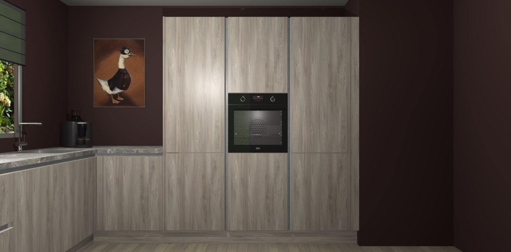 Welkom bij de Olm greeploze keuken Laos. Deze prachtige keuken zal de komende jaren het middelpunt van de belangstelling in uw huis zijn. Uitgerust met vijf inbouwapparaten komt u nooit kookgereedschap tekort. Bovendien geeft de warme houtlook elke ruimte een uitnodigende en tijdloze uitstraling.