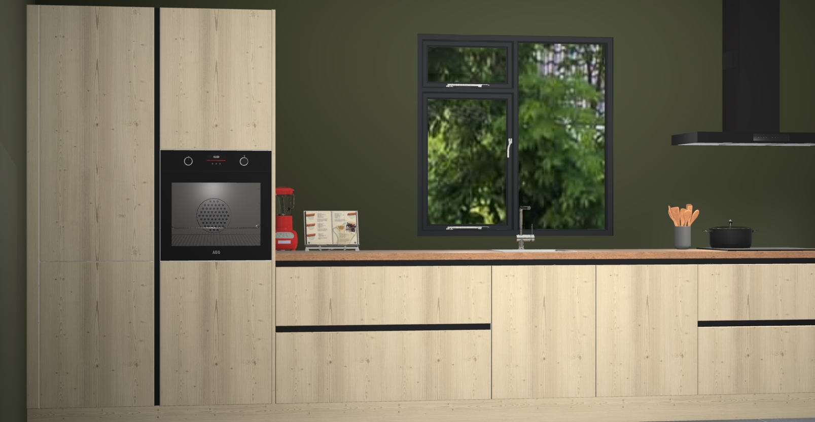 De Olm keuken Lille wordt geleverd met vijf inbouwapparaten - een oven, inductiekookplaat, afzuigkap, vaatwasser en koelkast. Maar dat is nog niet alles! Na bestelling kunnen deze apparaten eenvoudig worden geüpgraded naar premium AEG-apparatuur. Bovendien is er zelfs de optie om de oven te vervangen door een combimagnetron of uw inductiekookplaat te vervangen door een kookplaat met geïntegreerde afzuiging.