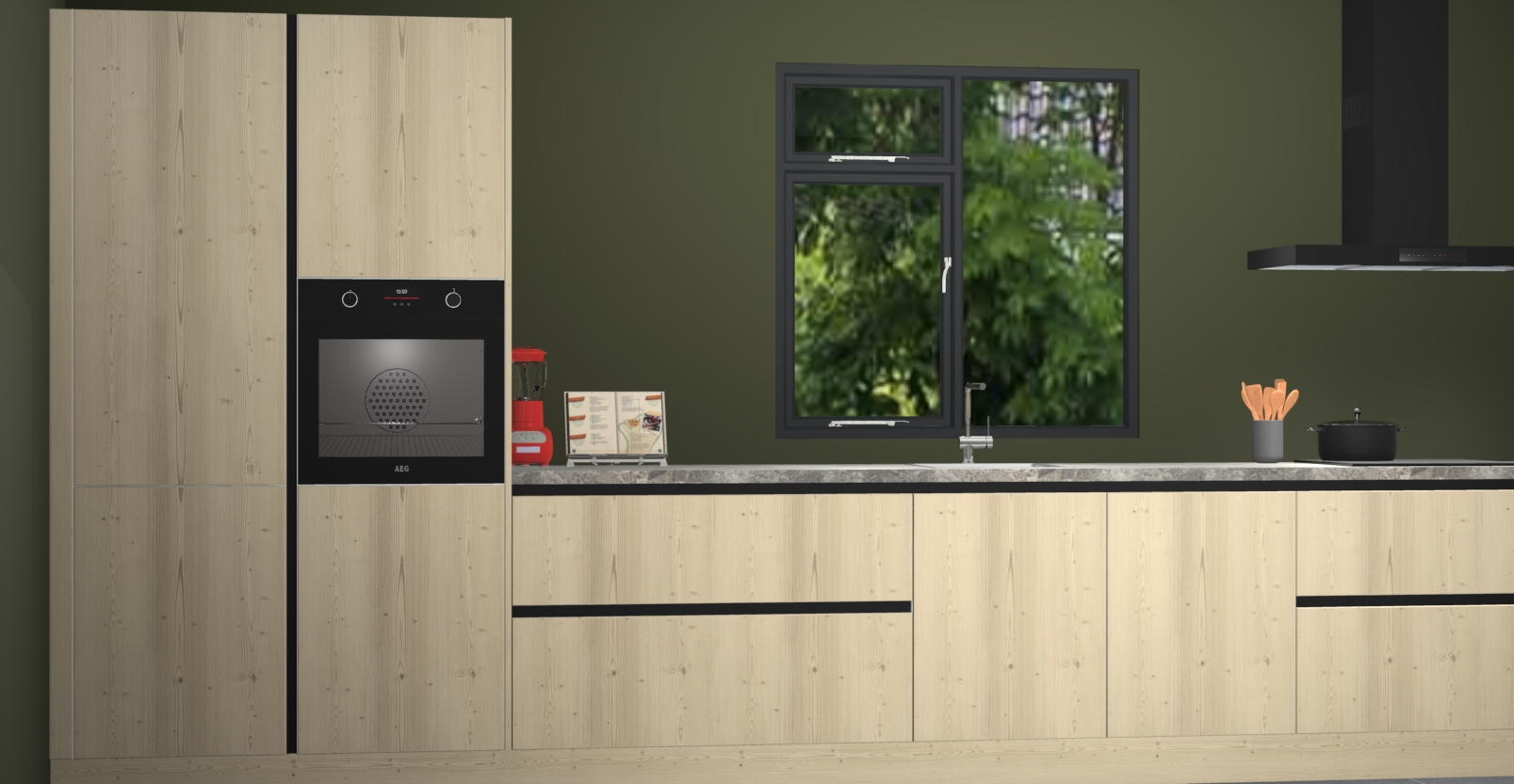 De Olm keuken Lille wordt geleverd met vijf inbouwapparaten - een oven, inductiekookplaat, afzuigkap, vaatwasser en koelkast. Maar dat is nog niet alles! Na bestelling kunnen deze apparaten eenvoudig worden geüpgraded naar premium AEG-apparatuur. Bovendien is er zelfs de optie om de oven te vervangen door een combimagnetron of uw inductiekookplaat te vervangen door een kookplaat met geïntegreerde afzuiging.