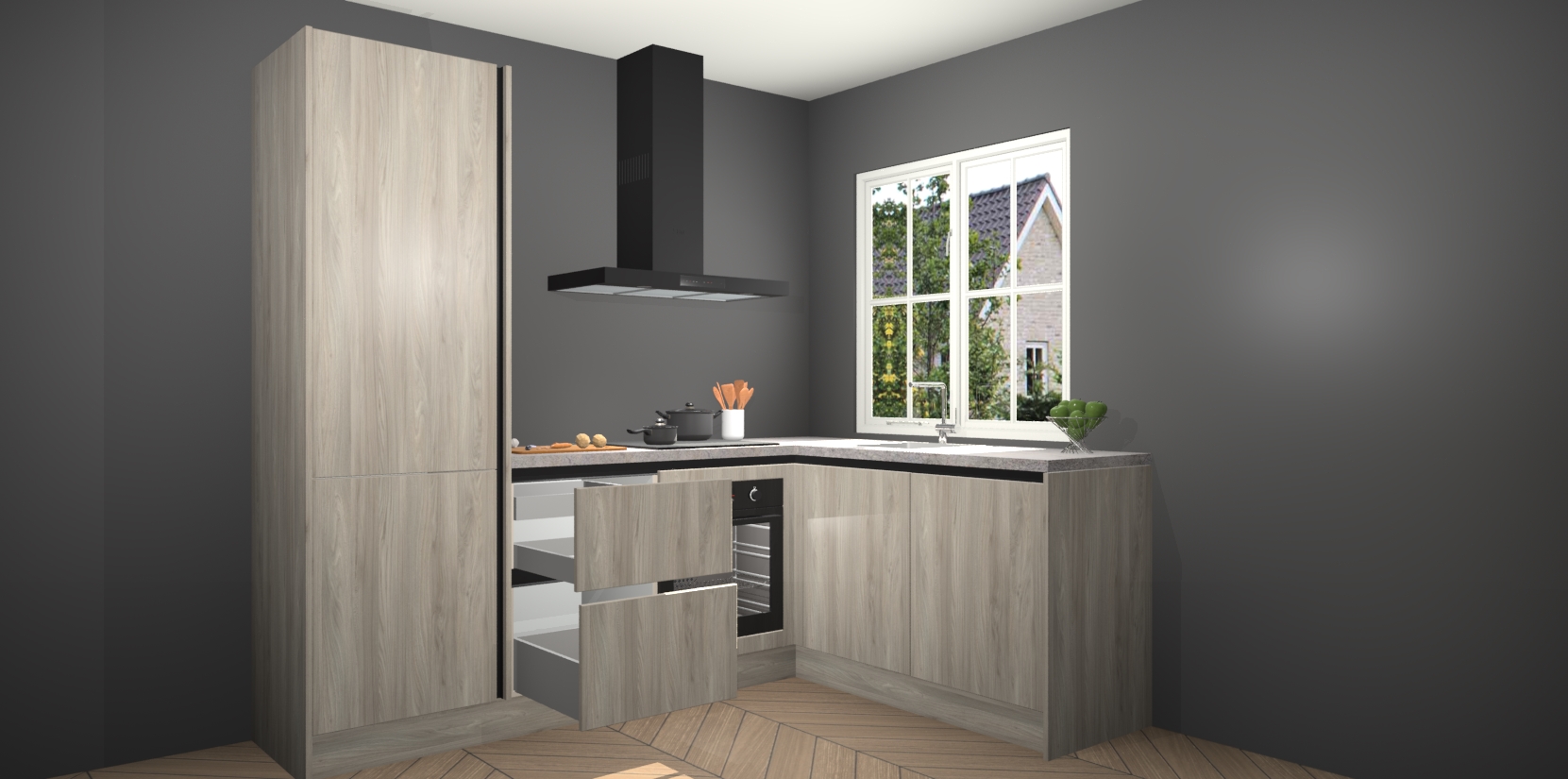 De Olm greeploze keuken Linz is de perfecte keuze voor uw nieuwe moderne en tijdloze keuken. Ga voor moderne en tijdloze elegantie in uw keuken. De prachtige hoekkeuken biedt een verfrissende kijk op de manier waarop we ons vertrouwde keukenontwerp kunnen aanpassen in een nieuwe stijl. Één blik om alles te zien: zo mooi dat het bijna magisch lijkt.