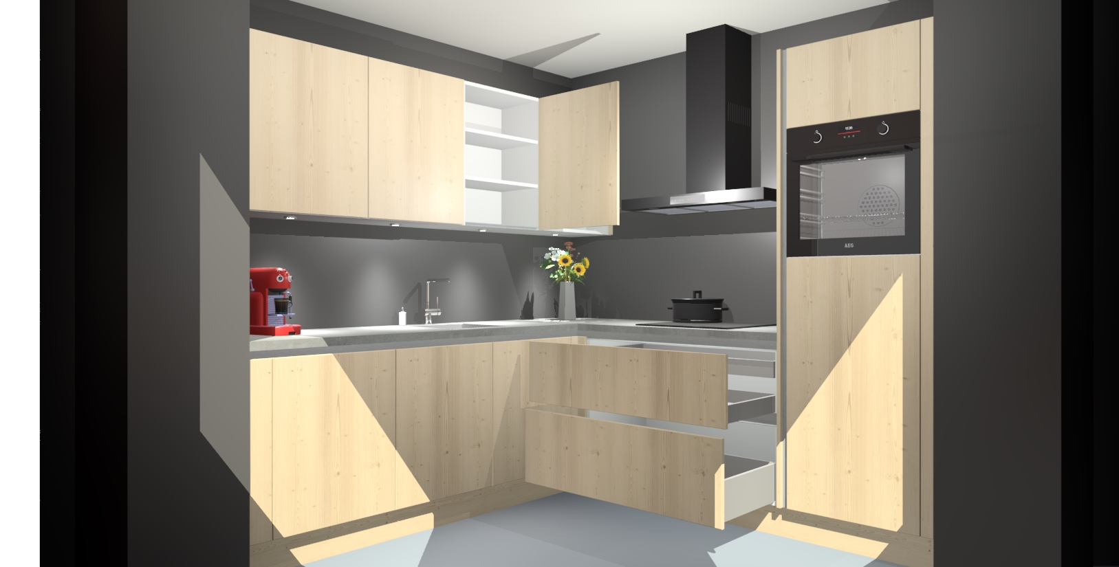 Met een modern, tijdloos design en ruime opslagruimte, zult u zich in no-time thuis voelen in uw nieuwe keuken. Uw leven wordt eenvoudiger met de soft-close deuren die voor het ultieme stille comfort zorgen - geen geluid dat u stoort terwijl u kookt. Ook is de keuken voorzien van 5 ingebouwde apparaten: een oven, inductie kookplaat, afzuigkap, vaatwasser en koelkast. Deze kunnen gemakkelijk na bestelling worden bijgewerkt naar AEG - waardoor uw luxe ervaring compleet is.