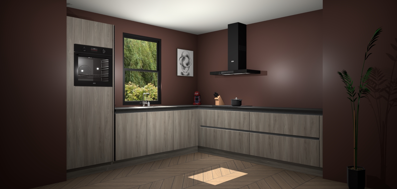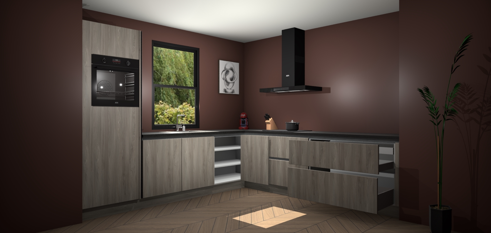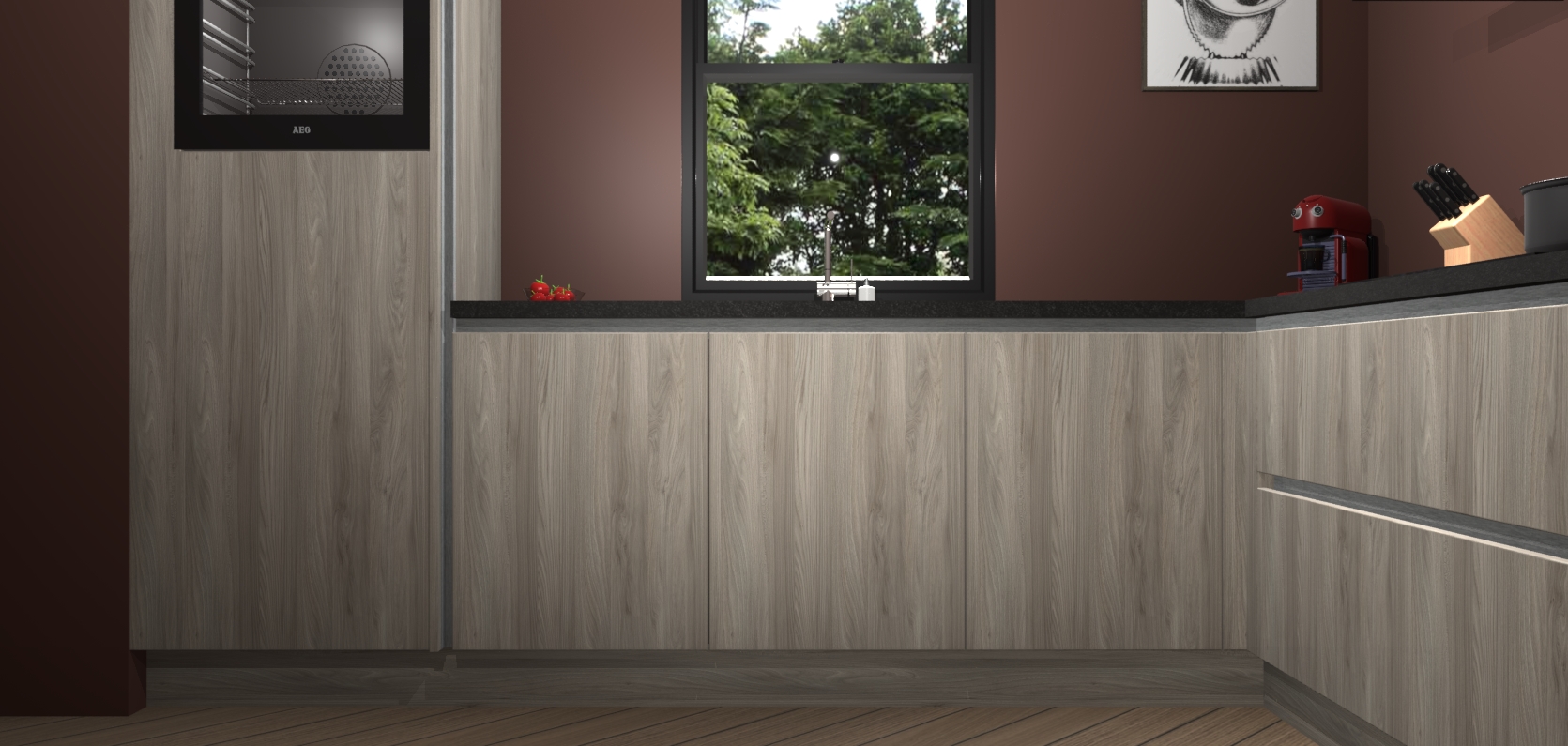 Welkom bij de olm keuken Lublin. Deze prachtige keuken zal de komende jaren het middelpunt van de belangstelling in uw huis zijn. Uitgerust met vijf inbouwapparaten komt u nooit kookgereedschap tekort. Bovendien geeft de warme houtlook elke ruimte een uitnodigende en tijdloze uitstraling.
