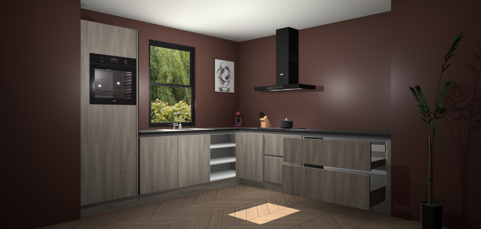 Welkom bij de olm keuken Lublin. Deze prachtige keuken zal de komende jaren het middelpunt van de belangstelling in uw huis zijn. Uitgerust met vijf inbouwapparaten komt u nooit kookgereedschap tekort. Bovendien geeft de warme houtlook elke ruimte een uitnodigende en tijdloze uitstraling.