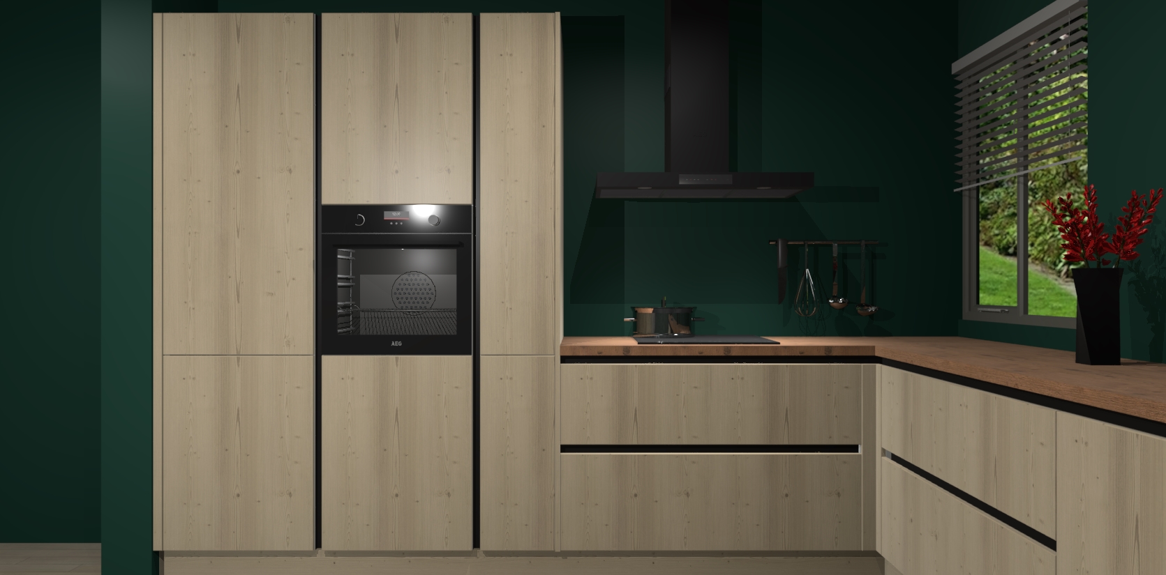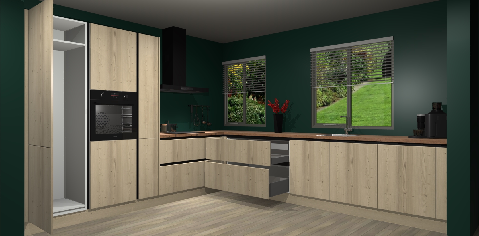 Welkom bij de Olm keuken Palermo. Deze prachtige keuken zal de komende jaren het middelpunt van de belangstelling in uw huis zijn. Uitgerust met vijf inbouwapparaten komt u nooit kookgereedschap tekort. Bovendien geeft de warme houtlook elke ruimte een uitnodigende en tijdloze uitstraling.