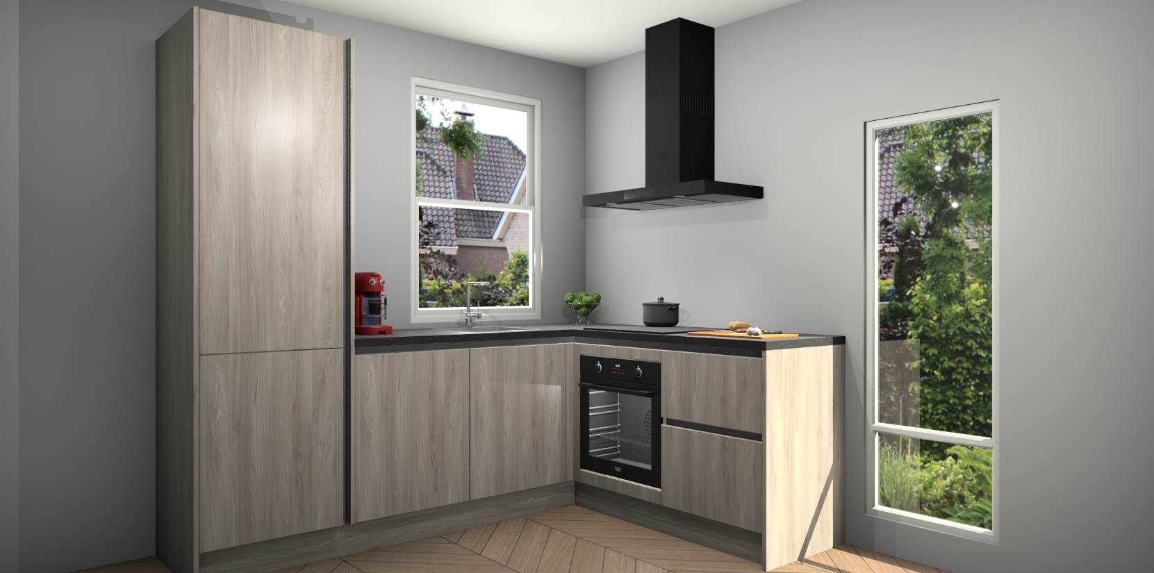 De prachtige Olm greeploze keuken Phuket is de perfecte keuze als u op zoek bent naar een moderne hoekkeuken met alle luxe en comfort die u kunt verwachten! De uitstraling in het houtlook-design draagt bij aan de warme sfeer die u nu al voelt wanneer u er naar kijkt. Heeft u genoeg van ouderwetse keukens? Probeer dan direct deze moderne, mooie hoekkeukens en laat iedereen verbluft achter!