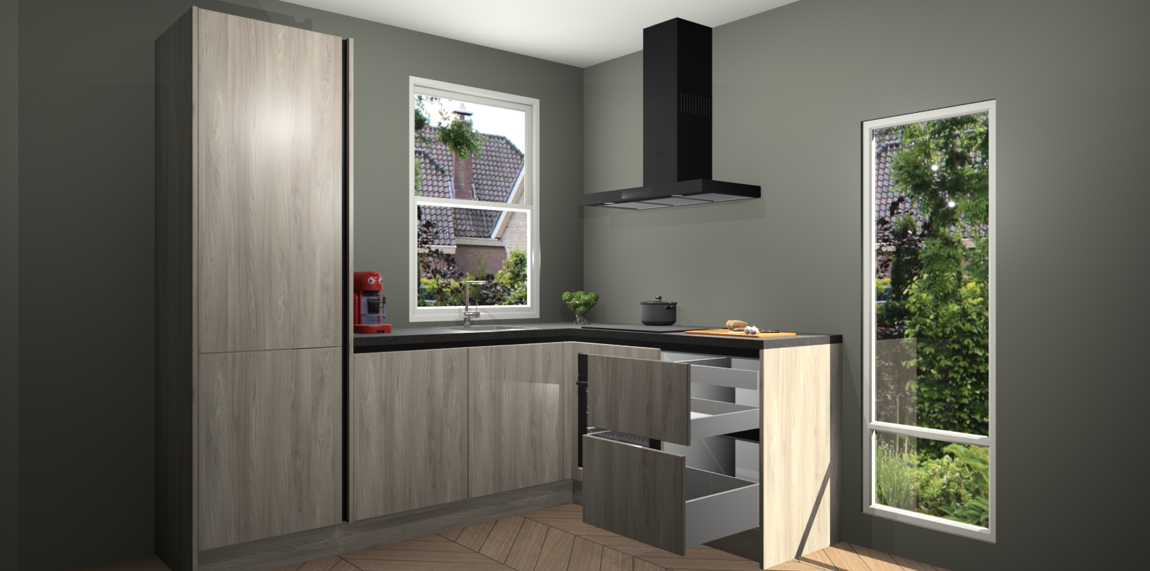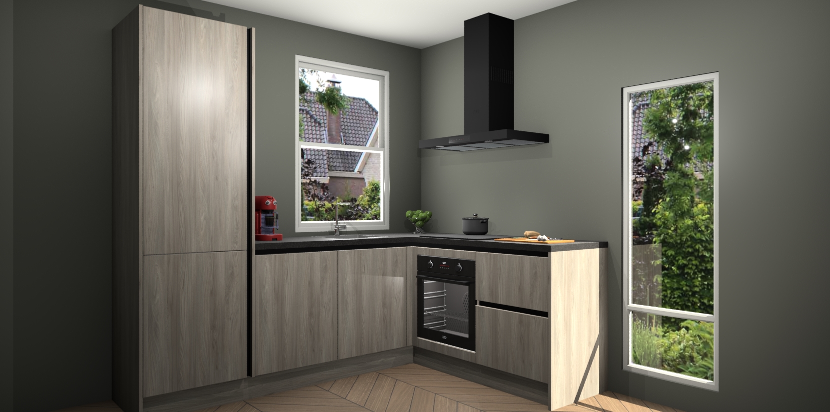 De prachtige Olm greeploze keuken Phuket is de perfecte keuze als u op zoek bent naar een moderne hoekkeuken met alle luxe en comfort die u kunt verwachten! De uitstraling in het houtlook-design draagt bij aan de warme sfeer die u nu al voelt wanneer u er naar kijkt. Heeft u genoeg van ouderwetse keukens? Probeer dan direct deze moderne, mooie hoekkeukens en laat iedereen verbluft achter!