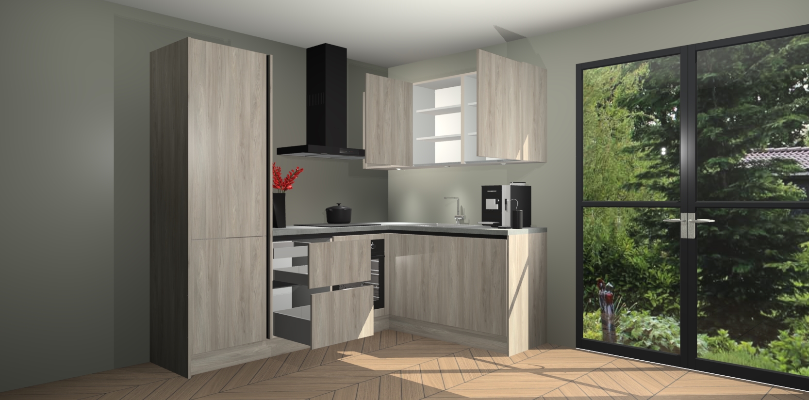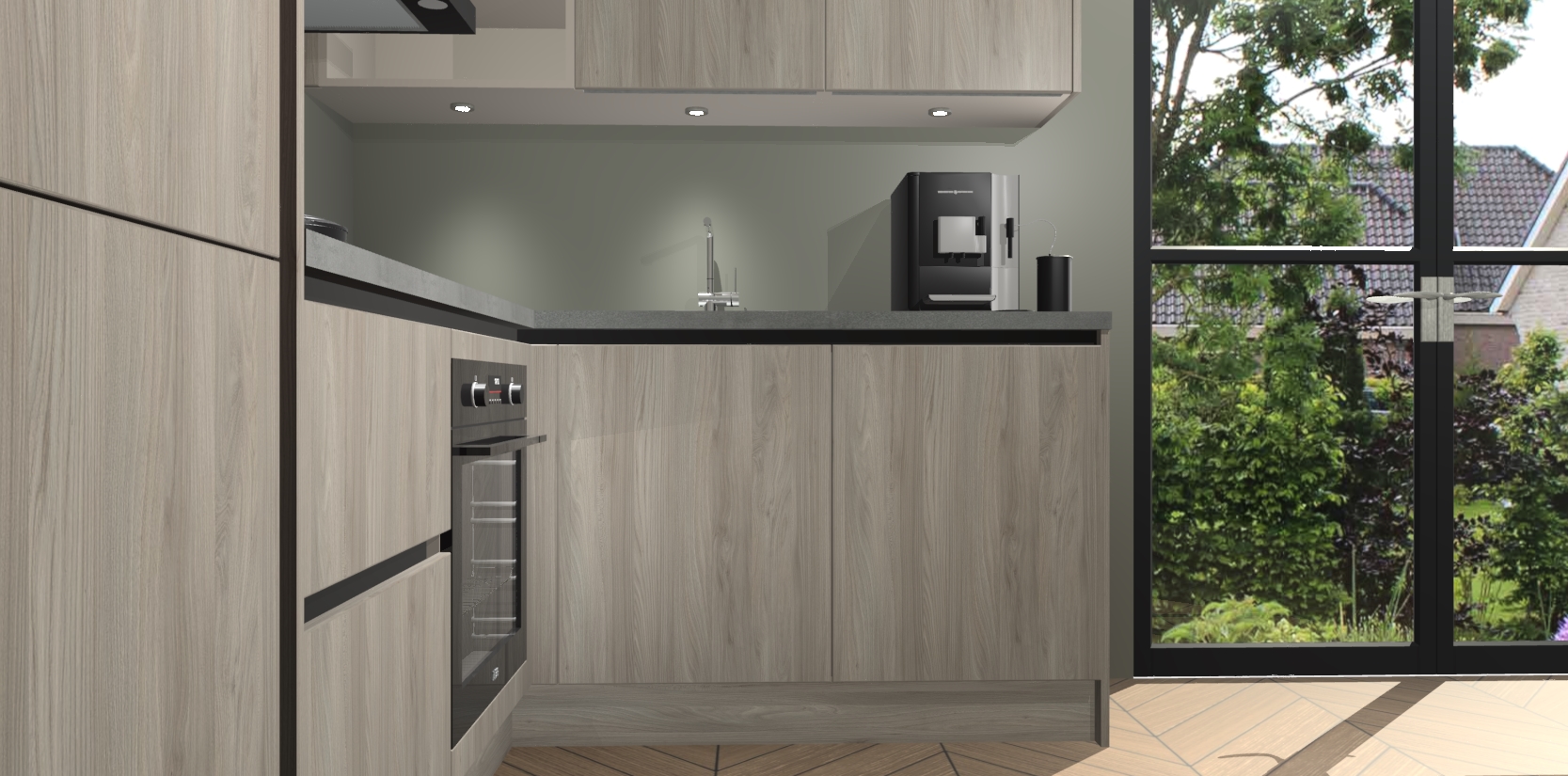 Wauw, dit is de Olm greeploze keuken Pilsen! U kunt gerust zeggen dat u elegantie combineert met functionaliteit met deze keuken. Met een modern en chique ontwerp is de keuken precies wat u nodig heeft om uw ruimte te verfraaien. De binnenzijde van de kasten is in dezelfde donkere kleur als de buitenzijde voor een uniforme look, compleet met softclose-kasten die stil sluiten.