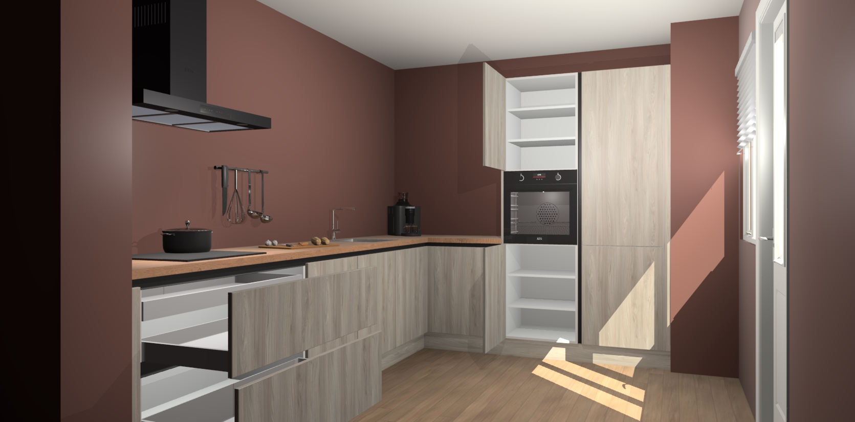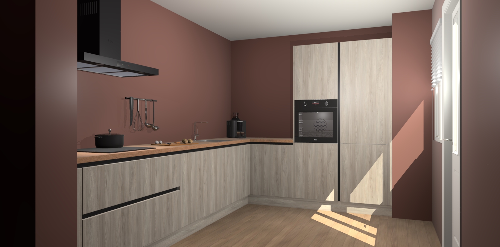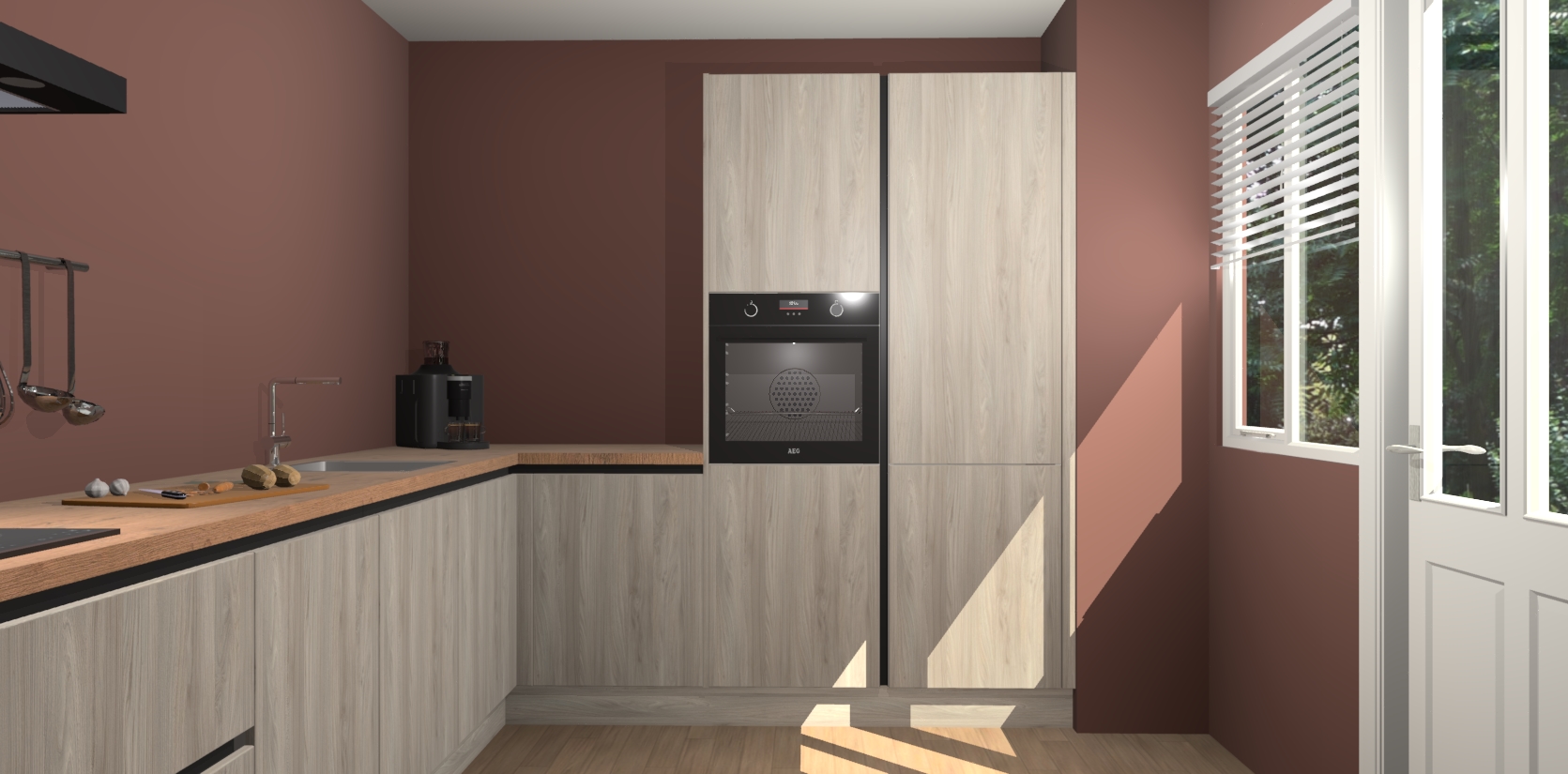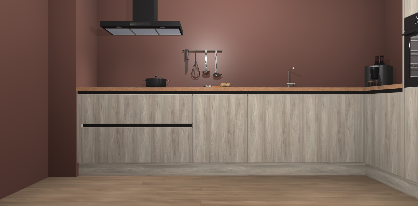 Welkom bij de Olm greeploze keuken Portland. Deze prachtige keuken zal de komende jaren het middelpunt van de belangstelling in uw huis zijn. Uitgerust met vijf inbouwapparaten komt u nooit kookgereedschap tekort. Bovendien geeft de warme houtlook elke ruimte een uitnodigende en tijdloze uitstraling.