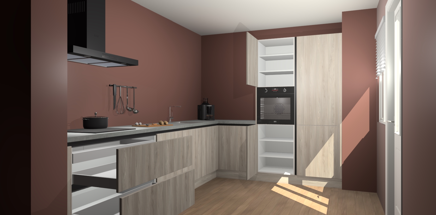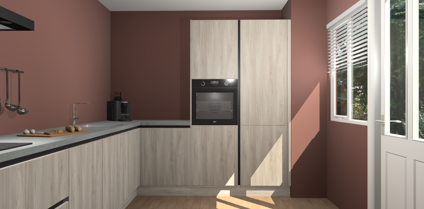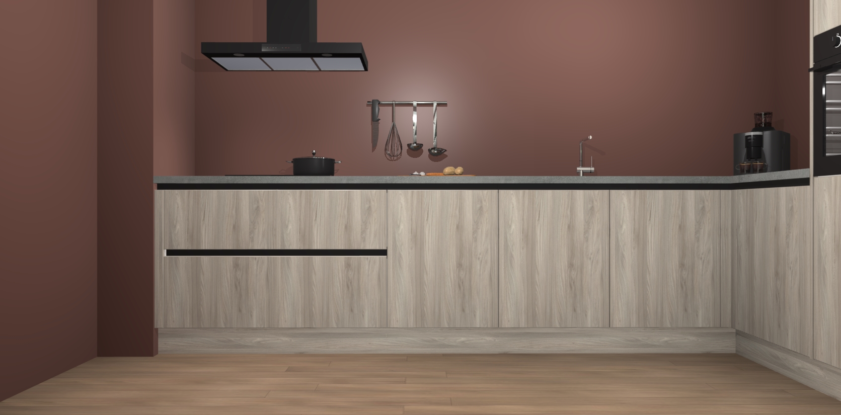 Welkom bij de Olm greeploze keuken Portland. Deze prachtige keuken zal de komende jaren het middelpunt van de belangstelling in uw huis zijn. Uitgerust met vijf inbouwapparaten komt u nooit kookgereedschap tekort. Bovendien geeft de warme houtlook elke ruimte een uitnodigende en tijdloze uitstraling.