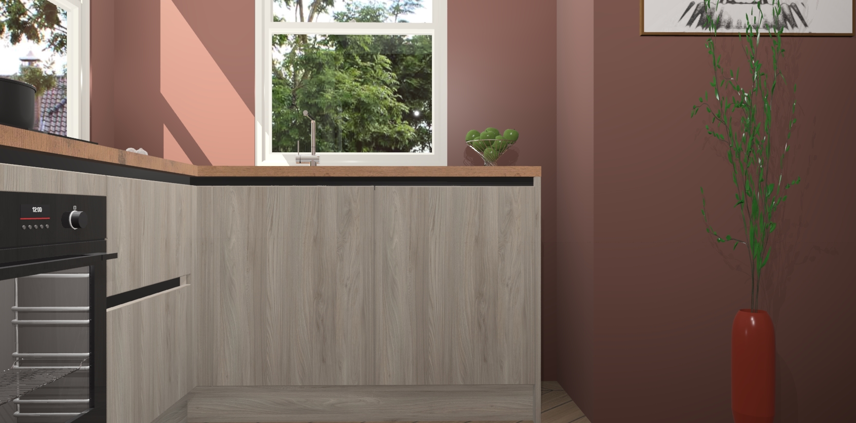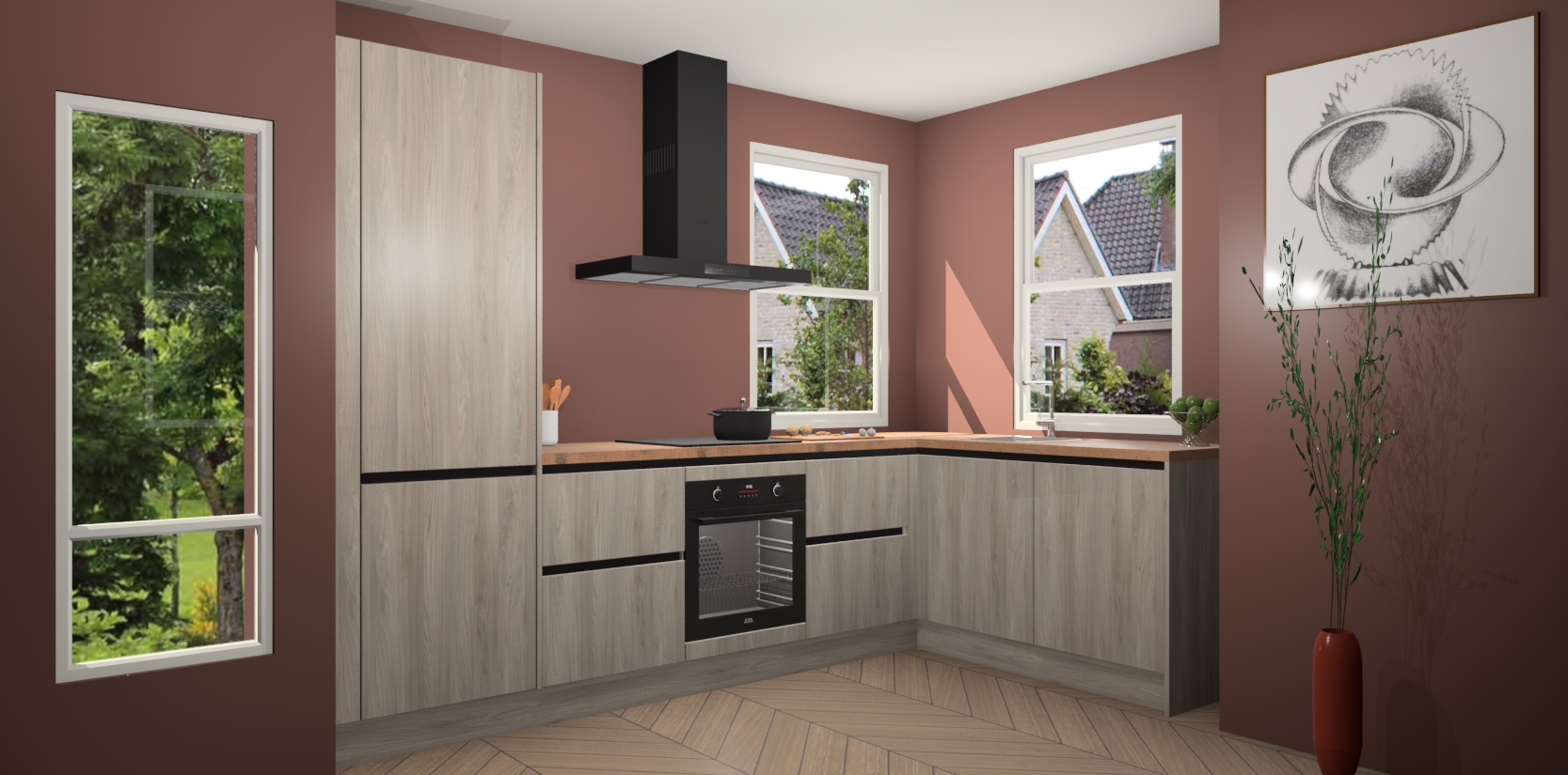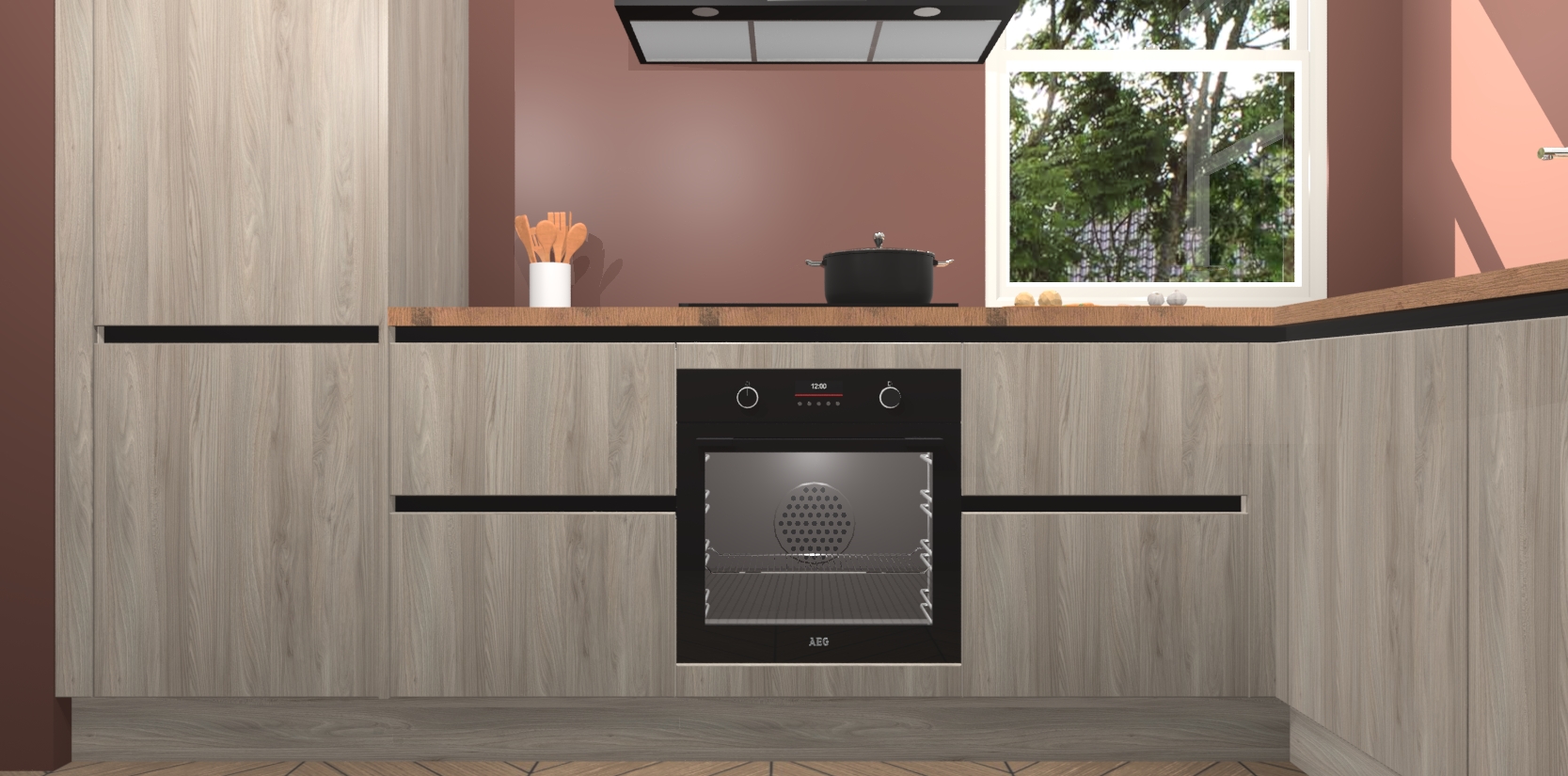 Wat maakt deze keuken zo bijzonder? Ten eerste geeft het houten werkblad uw ruimte een onmiskenbaar klassieke uitstraling. De natuurlijke afwerking roept warmte en elegantie op die nooit uit de mode zullen raken. Bovendien is het gemakkelijk schoon te houden en te onderhouden, zodat je er jarenlang plezier van kunt hebben. Als u op zoek bent naar extra gemak in uw keuken, dan heeft u bij het plaatsen van een bestelling bij ons ook de optie om uw toestellen te upgraden naar AEG-modellen - zo haalt u moderne innovatie van topmerken in apparatentechnologie rechtstreeks in huis.