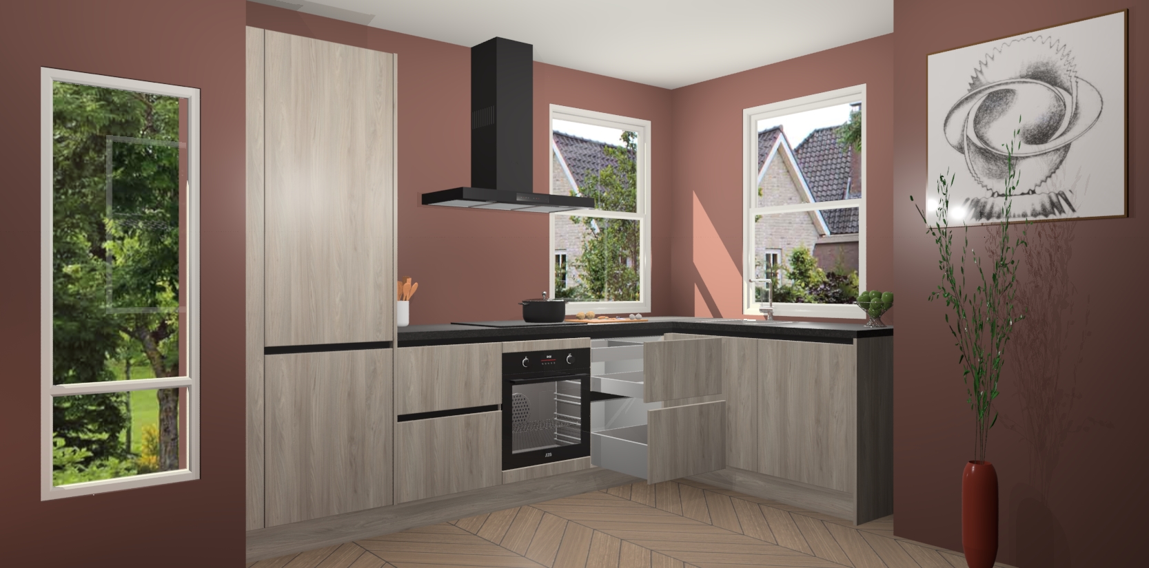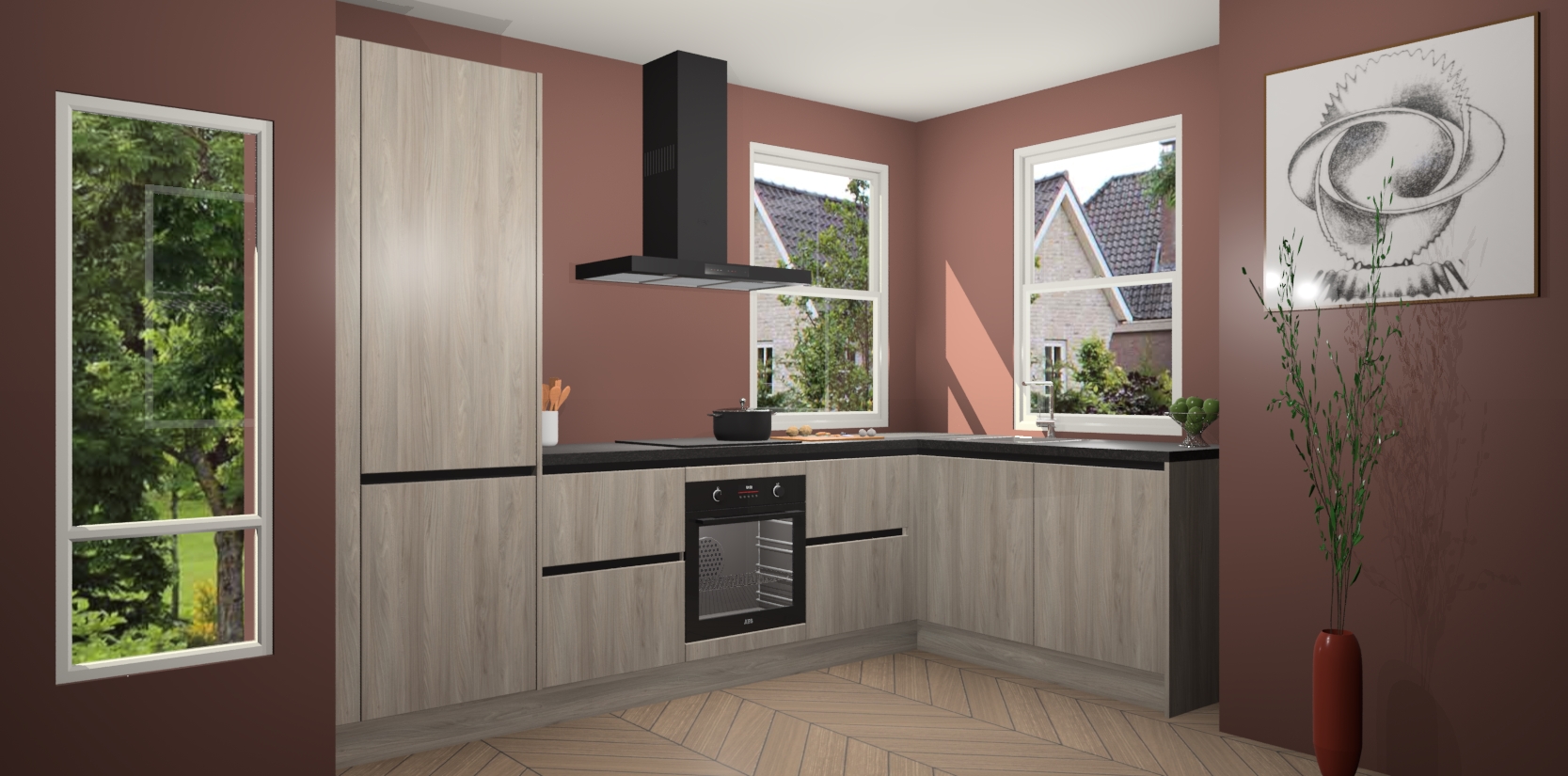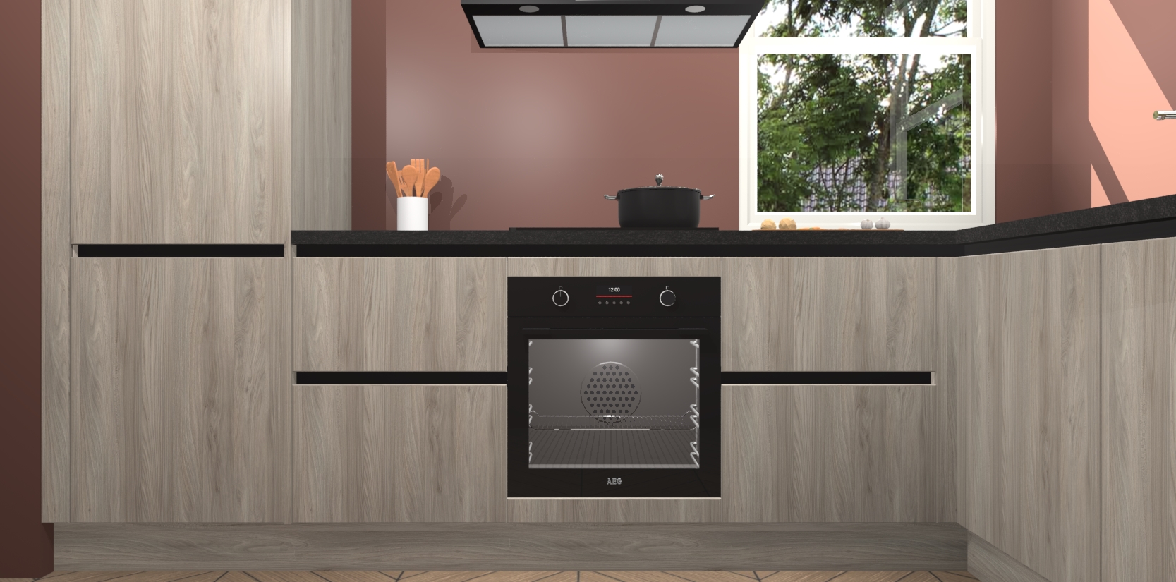 Wat maakt deze keuken zo bijzonder? Ten eerste geeft het houten werkblad uw ruimte een onmiskenbaar klassieke uitstraling. De natuurlijke afwerking roept warmte en elegantie op die nooit uit de mode zullen raken. Bovendien is het gemakkelijk schoon te houden en te onderhouden, zodat je er jarenlang plezier van kunt hebben. Als u op zoek bent naar extra gemak in uw keuken, dan heeft u bij het plaatsen van een bestelling bij ons ook de optie om uw toestellen te upgraden naar AEG-modellen - zo haalt u moderne innovatie van topmerken in apparatentechnologie rechtstreeks in huis.