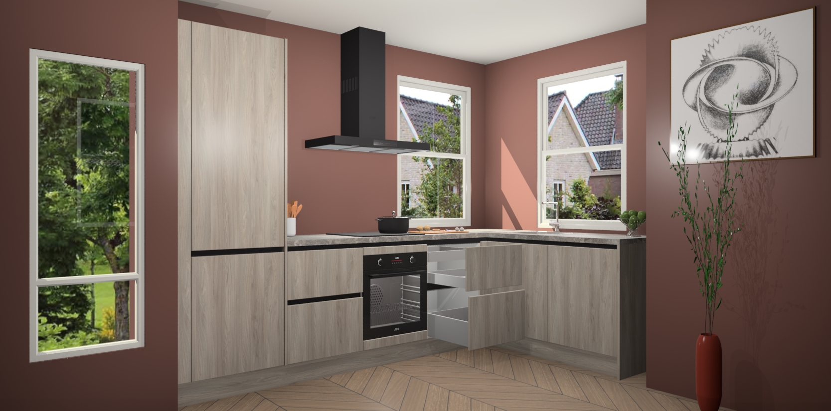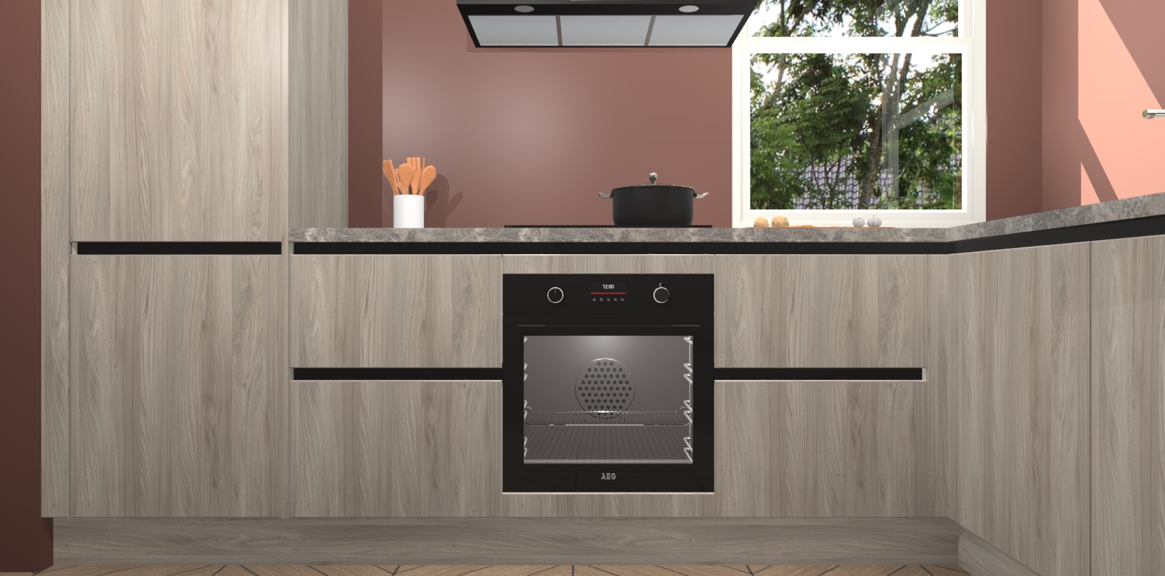 Wat maakt deze keuken zo bijzonder? Ten eerste geeft het houten werkblad uw ruimte een onmiskenbaar klassieke uitstraling. De natuurlijke afwerking roept warmte en elegantie op die nooit uit de mode zullen raken. Bovendien is het gemakkelijk schoon te houden en te onderhouden, zodat je er jarenlang plezier van kunt hebben. Als u op zoek bent naar extra gemak in uw keuken, dan heeft u bij het plaatsen van een bestelling bij ons ook de optie om uw toestellen te upgraden naar AEG-modellen - zo haalt u moderne innovatie van topmerken in apparatentechnologie rechtstreeks in huis.