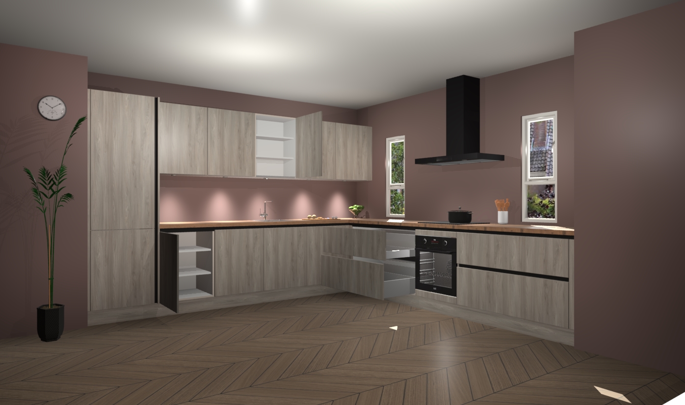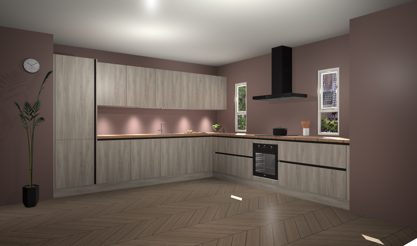 De olm greeploze keuken is een ideale hoekkeuken en heeft alle functies en apparatuur die u maar nodig kunt hebben. Bij de bestelling krijgt u een oven, inductiekookplaat, afzuigkap, vaatwasser en koelkast - deze kunnen desgewenst eenvoudig worden uitgebreid naar AEG na bestellen. Elke kast wordt ook voor gemonteerd geleverd met soft close deuren die jarenlang gebruik beloven. Stelt u zich voor dat u geen gedoe heeft met vervelende montage - vanaf het moment dat u uw bestelling plaats, duurt het slechts 7 weken voor het bij u thuis geleverd wordt.