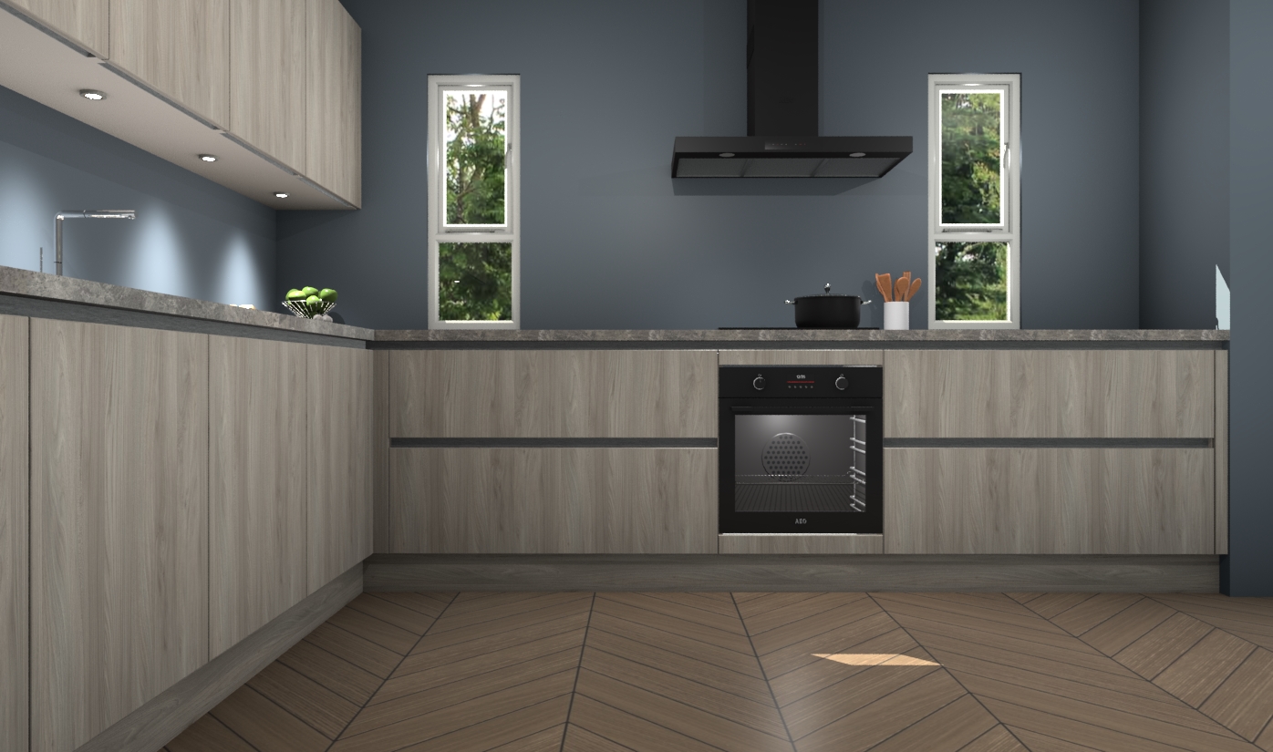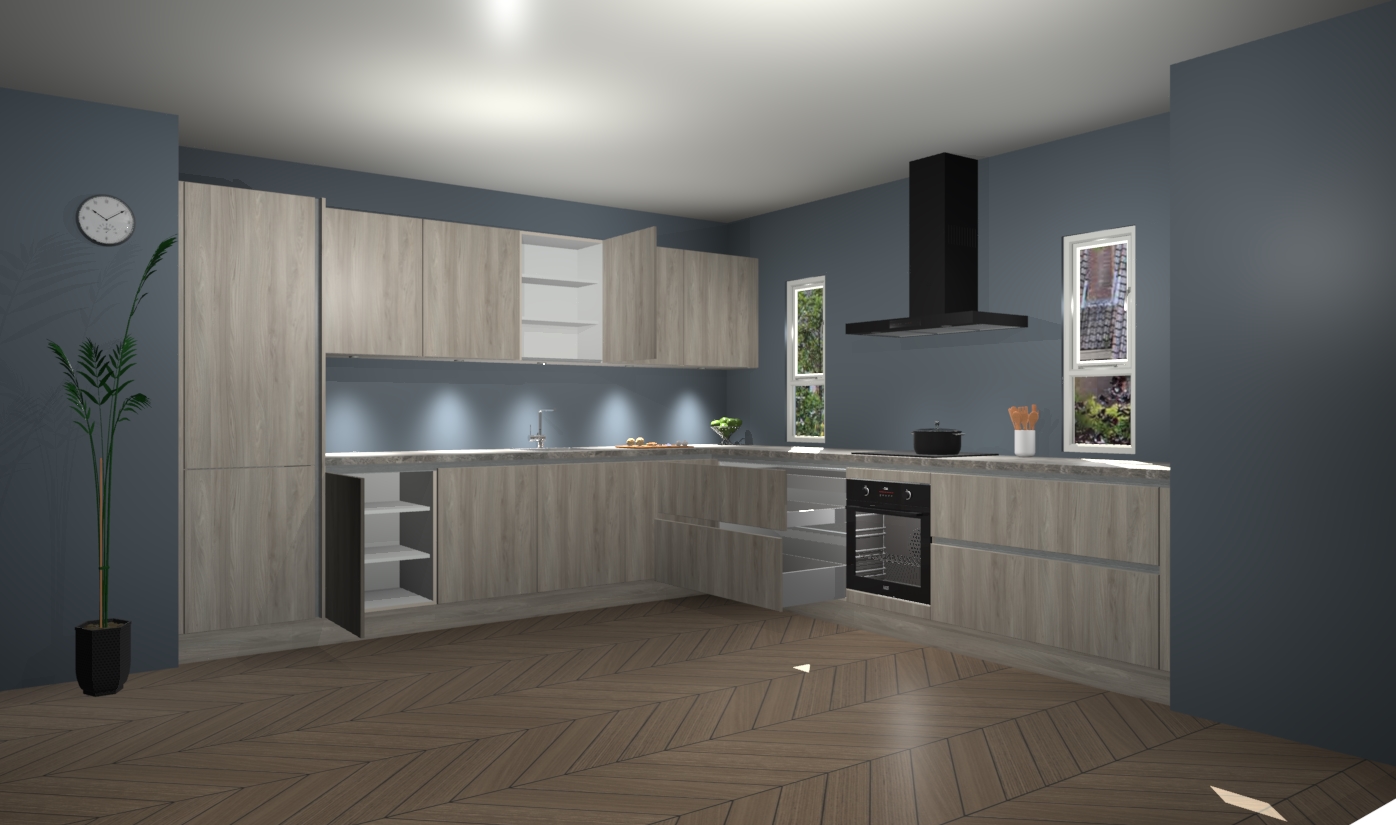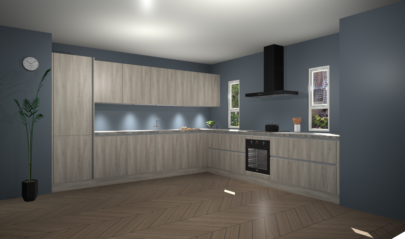 De olm greeploze keuken is een ideale hoekkeuken en heeft alle functies en apparatuur die u maar nodig kunt hebben. Bij de bestelling krijgt u een oven, inductiekookplaat, afzuigkap, vaatwasser en koelkast - deze kunnen desgewenst eenvoudig worden uitgebreid naar AEG na bestellen. Elke kast wordt ook voor gemonteerd geleverd met soft close deuren die jarenlang gebruik beloven. Stelt u zich voor dat u geen gedoe heeft met vervelende montage - vanaf het moment dat u uw bestelling plaats, duurt het slechts 7 weken voor het bij u thuis geleverd wordt.
