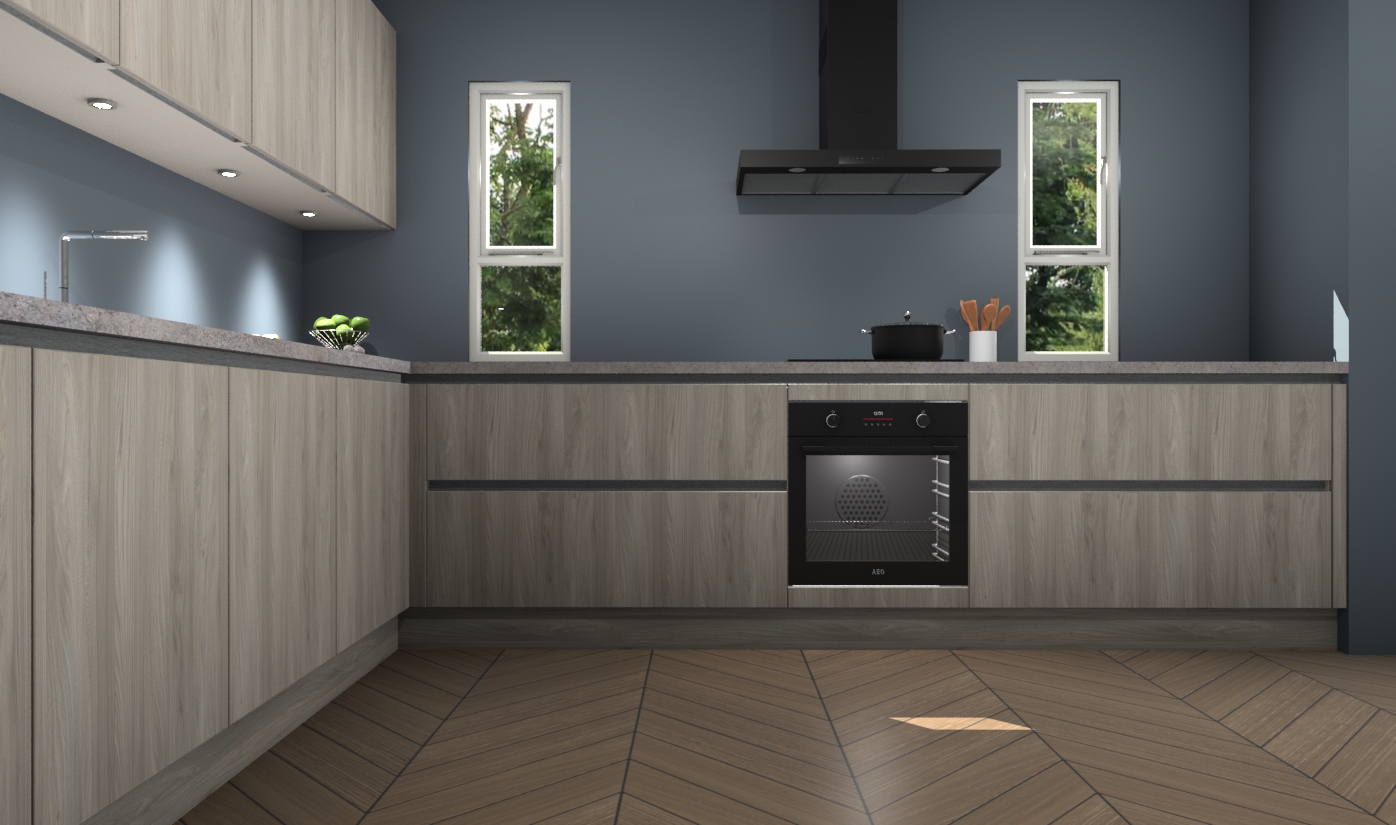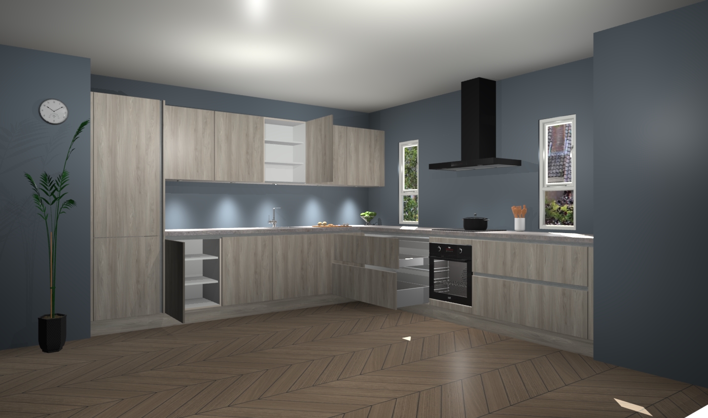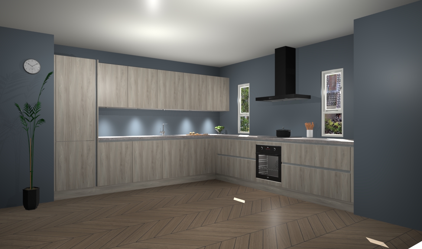 De olm greeploze keuken is een ideale hoekkeuken en heeft alle functies en apparatuur die u maar nodig kunt hebben. Bij de bestelling krijgt u een oven, inductiekookplaat, afzuigkap, vaatwasser en koelkast - deze kunnen desgewenst eenvoudig worden uitgebreid naar AEG na bestellen. Elke kast wordt ook voor gemonteerd geleverd met soft close deuren die jarenlang gebruik beloven. Stelt u zich voor dat u geen gedoe heeft met vervelende montage - vanaf het moment dat u uw bestelling plaats, duurt het slechts 7 weken voor het bij u thuis geleverd wordt.