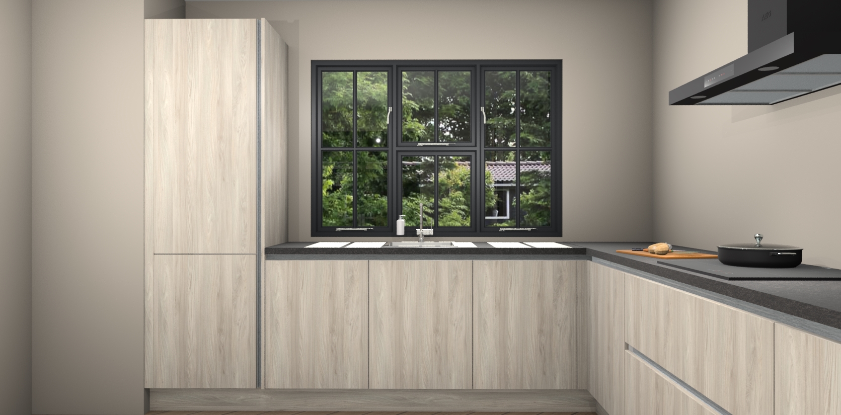 Elke kast heeft softclose deuren die geruisloos openen en sluiten telkens als u ze gebruikt, zodat er geen extra geluid is dat gesprekken of maaltijden in de keuken verstoort.
