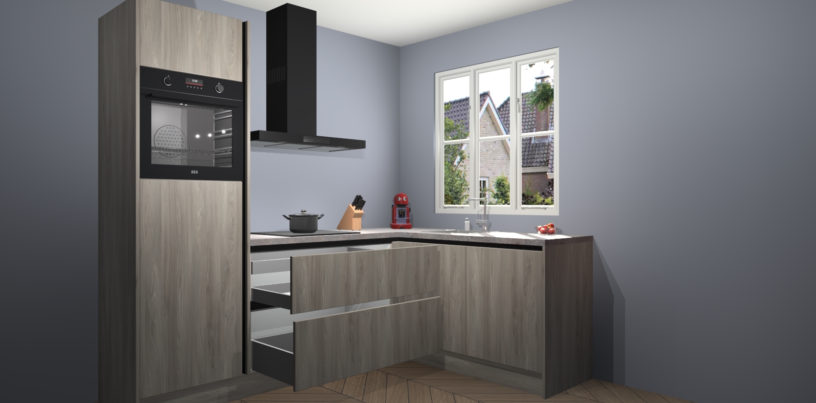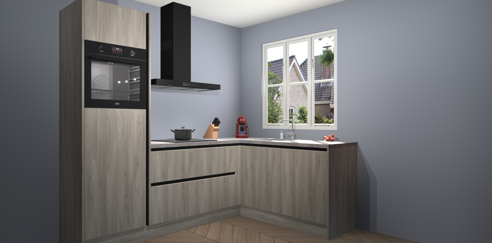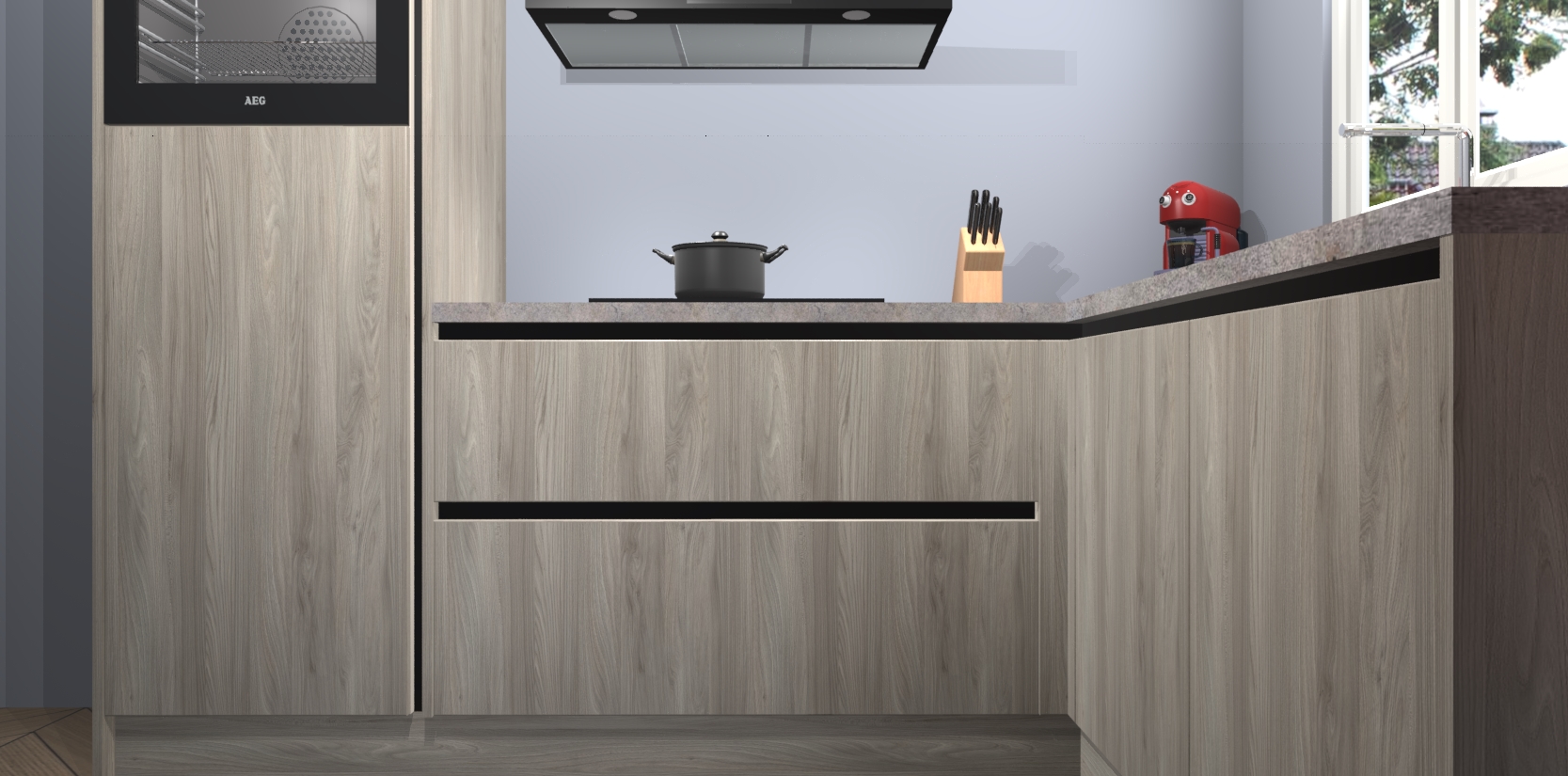 Dit model biedt u voldoende opbergruimte en vijf ingebouwde apparaten: een oven, inductiekookplaat, afzuigkap, vaatwasser en koelkast. Deze apparaten kunnen gemakkelijk worden geüpgrade naar AEG nadat u besteld heeft. De verschillende laden en kastjes bevatten softclose-deuren waardoor ze gezellig dichtvallen met een geruststellend helemaal geruisloos geluid. En dat is nog niet alles! We garanderen ook dat de prijs altijd laag blijft - dus haal nu uw Olm greeploze keuken Victoria terwijl het kan.