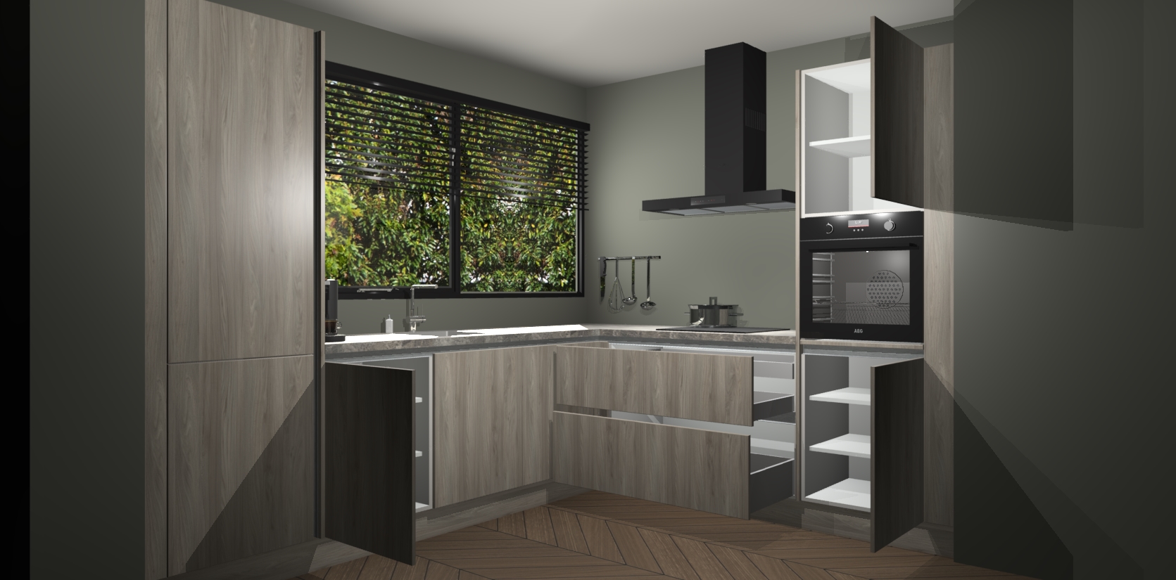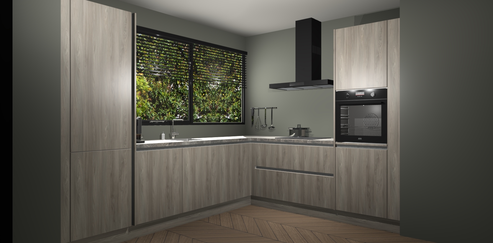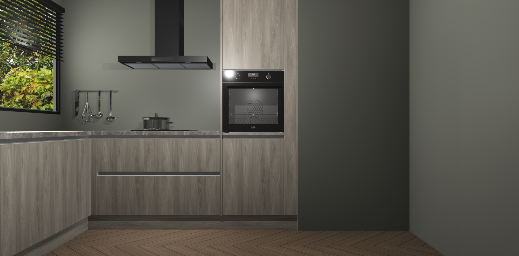 Met een modern, tijdloos design en ruime opslagruimte, zult u zich in no-time thuis voelen in uw nieuwe keuken. Uw leven wordt eenvoudiger met de soft-close deuren die voor het ultieme stille comfort zorgen - geen geluid dat u stoort terwijl u kookt. Ook is de keuken voorzien van 5 ingebouwde apparaten: een oven, inductie kookplaat, afzuigkap, vaatwasser en koelkast. Deze kunnen gemakkelijk na bestelling worden bijgewerkt naar AEG - waardoor uw luxe ervaring compleet is.